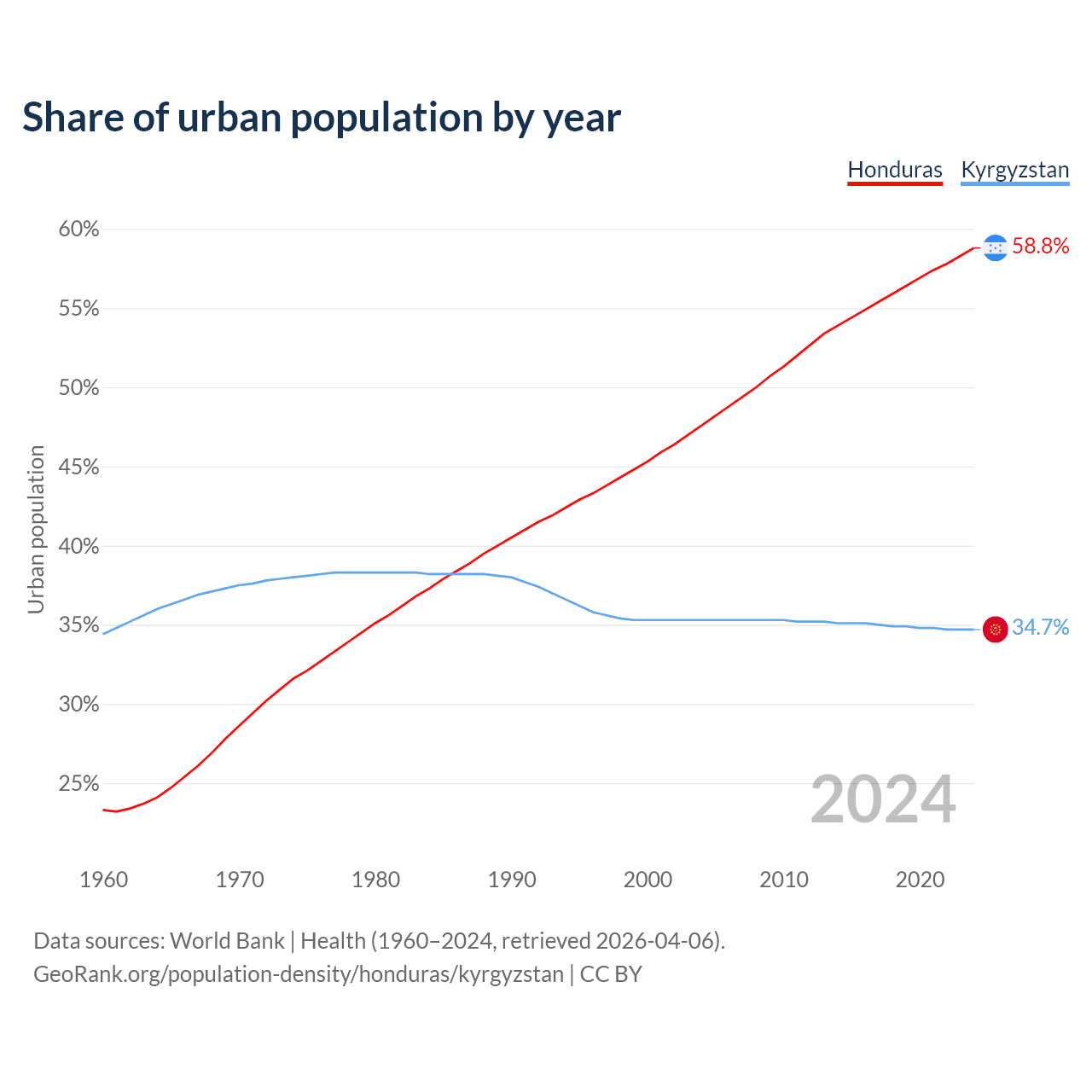From 2004 to 2024, the share of urban population changed from 47.6% to 58.8% in Honduras and from 35.3% to 34.7% in Kyrgyzstan.