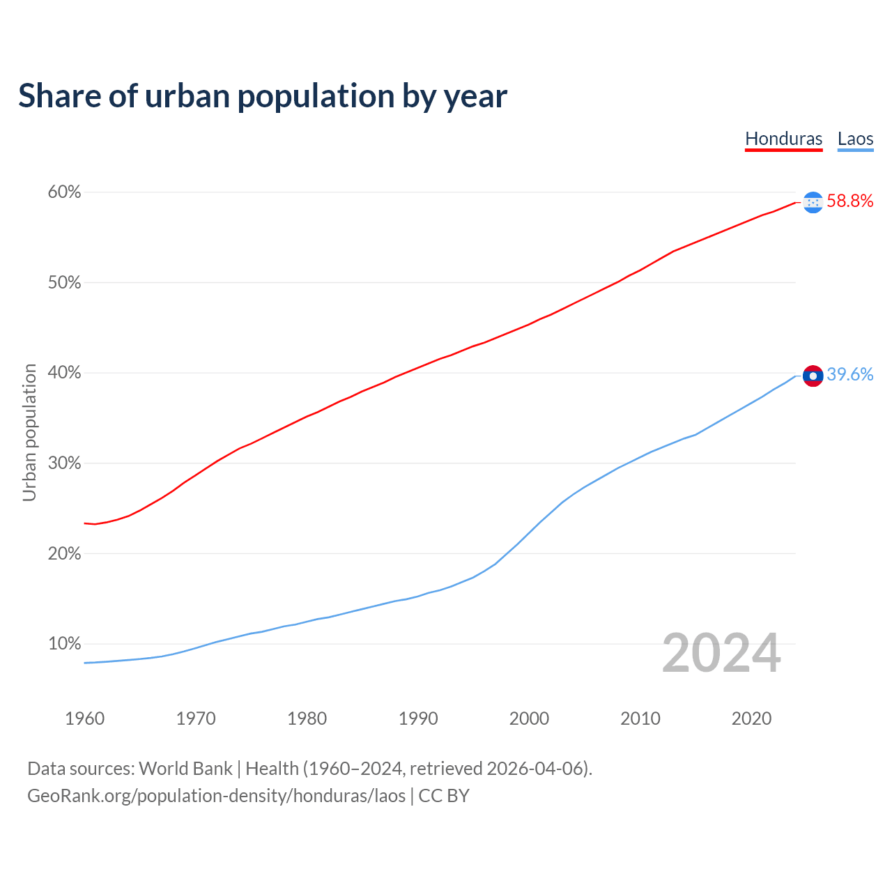 From 2004 to 2024, the share of urban population changed from 47.6% to 58.8% in Honduras and from 26.5% to 39.6% in Laos.