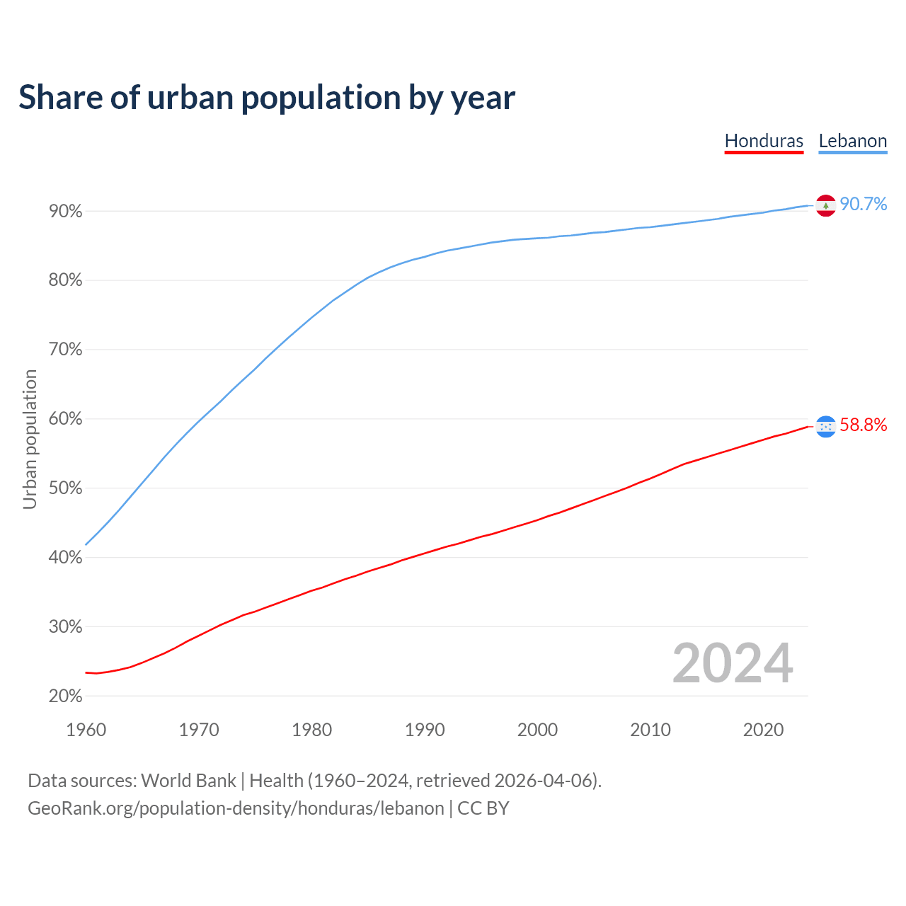 From 2004 to 2024, the share of urban population changed from 47.6% to 58.8% in Honduras and from 86.6% to 90.7% in Lebanon.