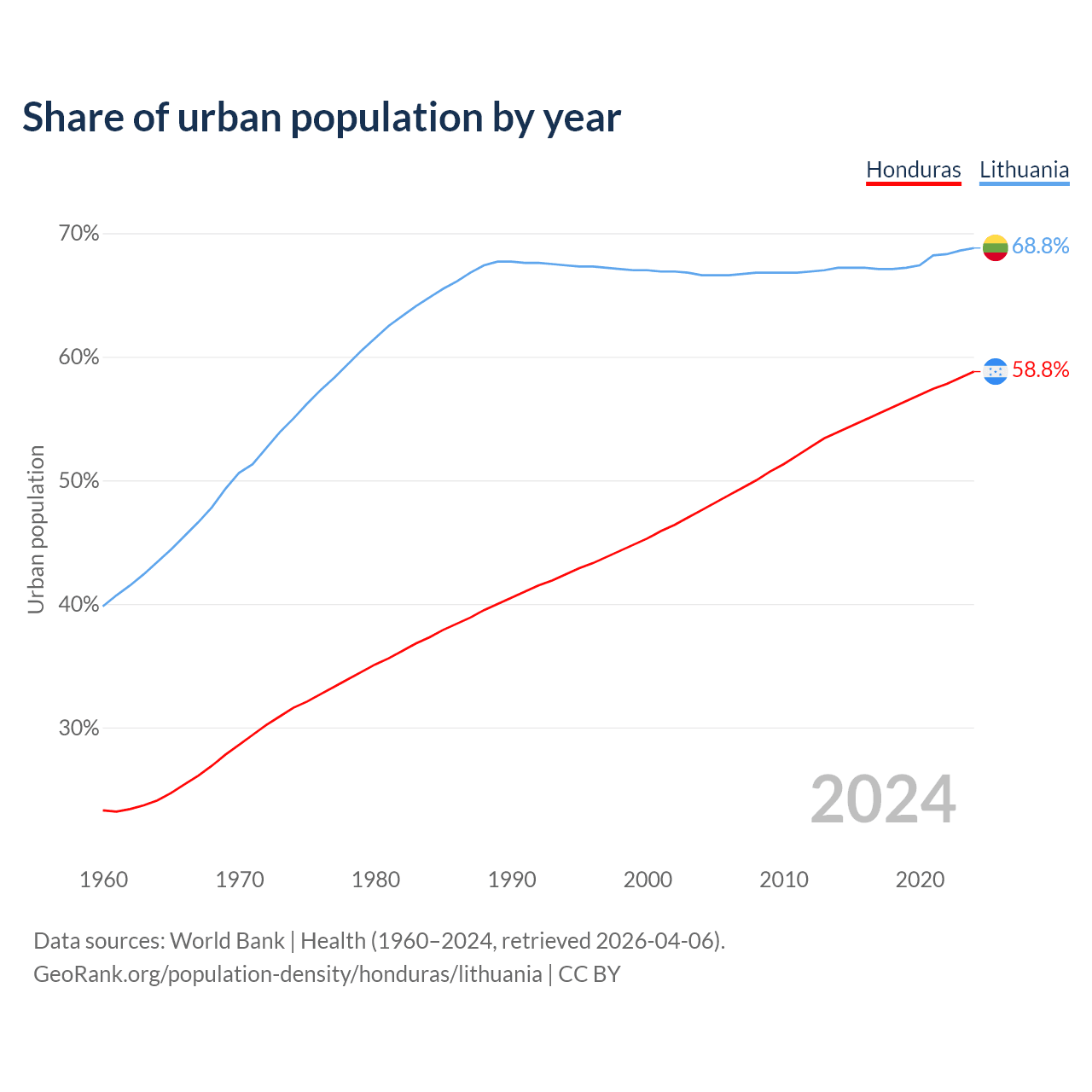 From 2004 to 2024, the share of urban population changed from 47.6% to 58.8% in Honduras and from 66.6% to 68.8% in Lithuania.