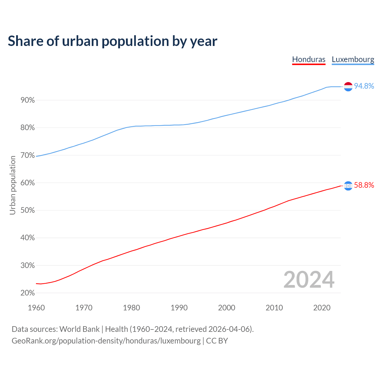 From 2004 to 2024, the share of urban population changed from 47.6% to 58.8% in Honduras and from 86% to 94.8% in Luxembourg.