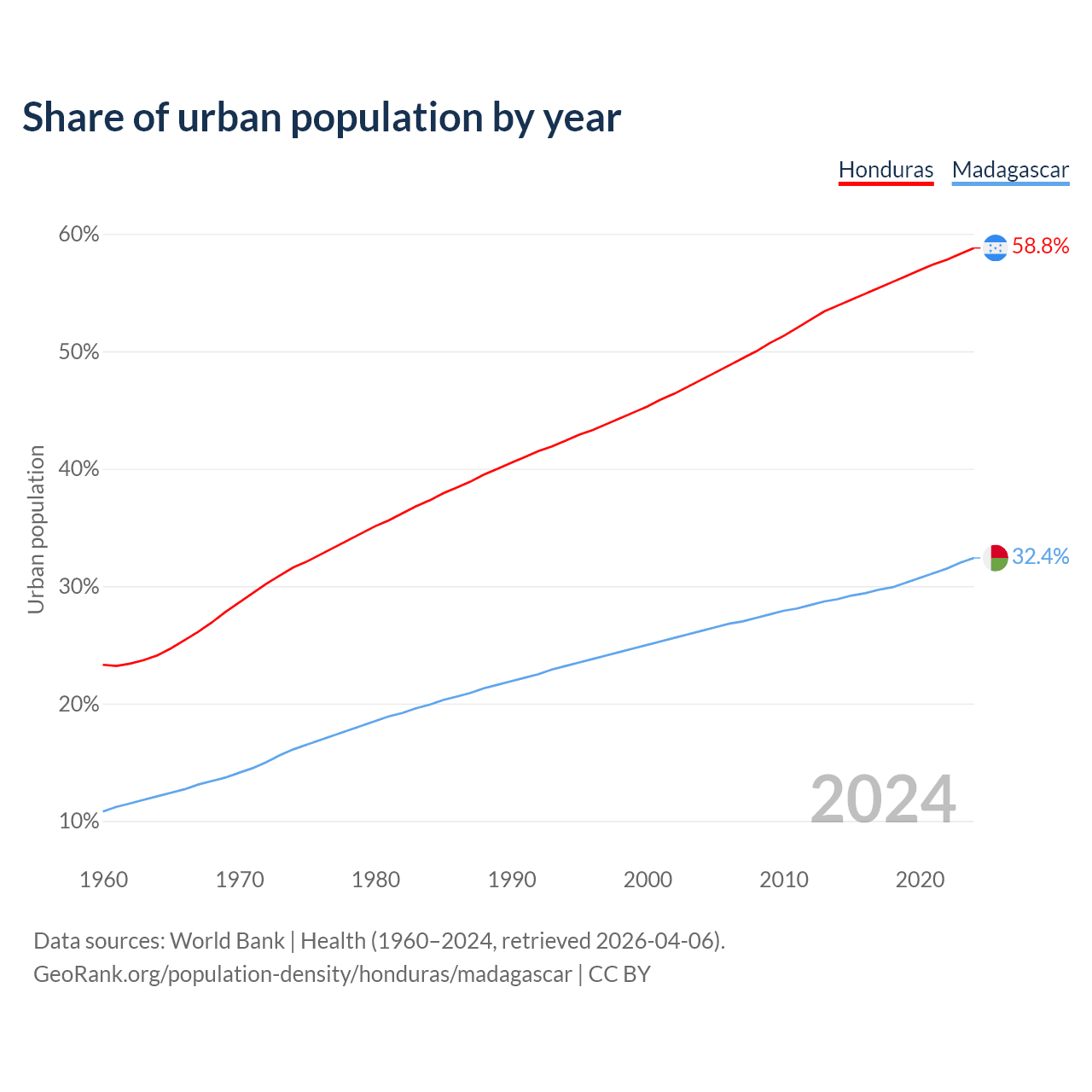 From 2004 to 2024, the share of urban population changed from 47.6% to 58.8% in Honduras and from 26.2% to 32.4% in Madagascar.