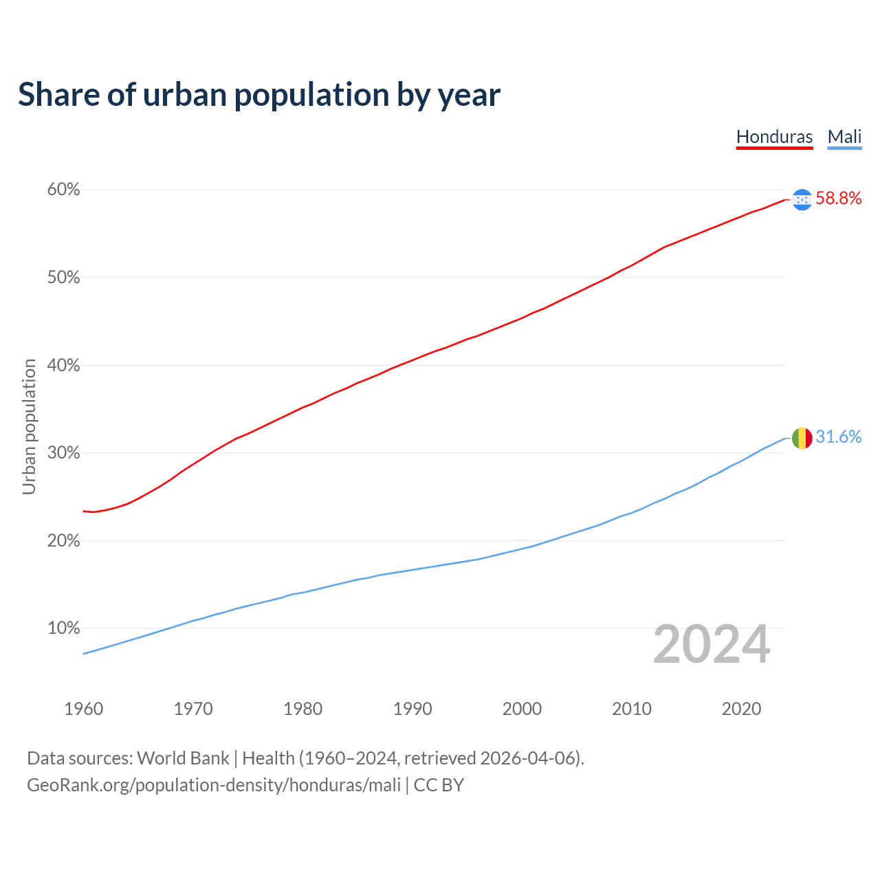 From 2004 to 2024, the share of urban population changed from 47.6% to 58.8% in Honduras and from 20.5% to 31.6% in Mali.