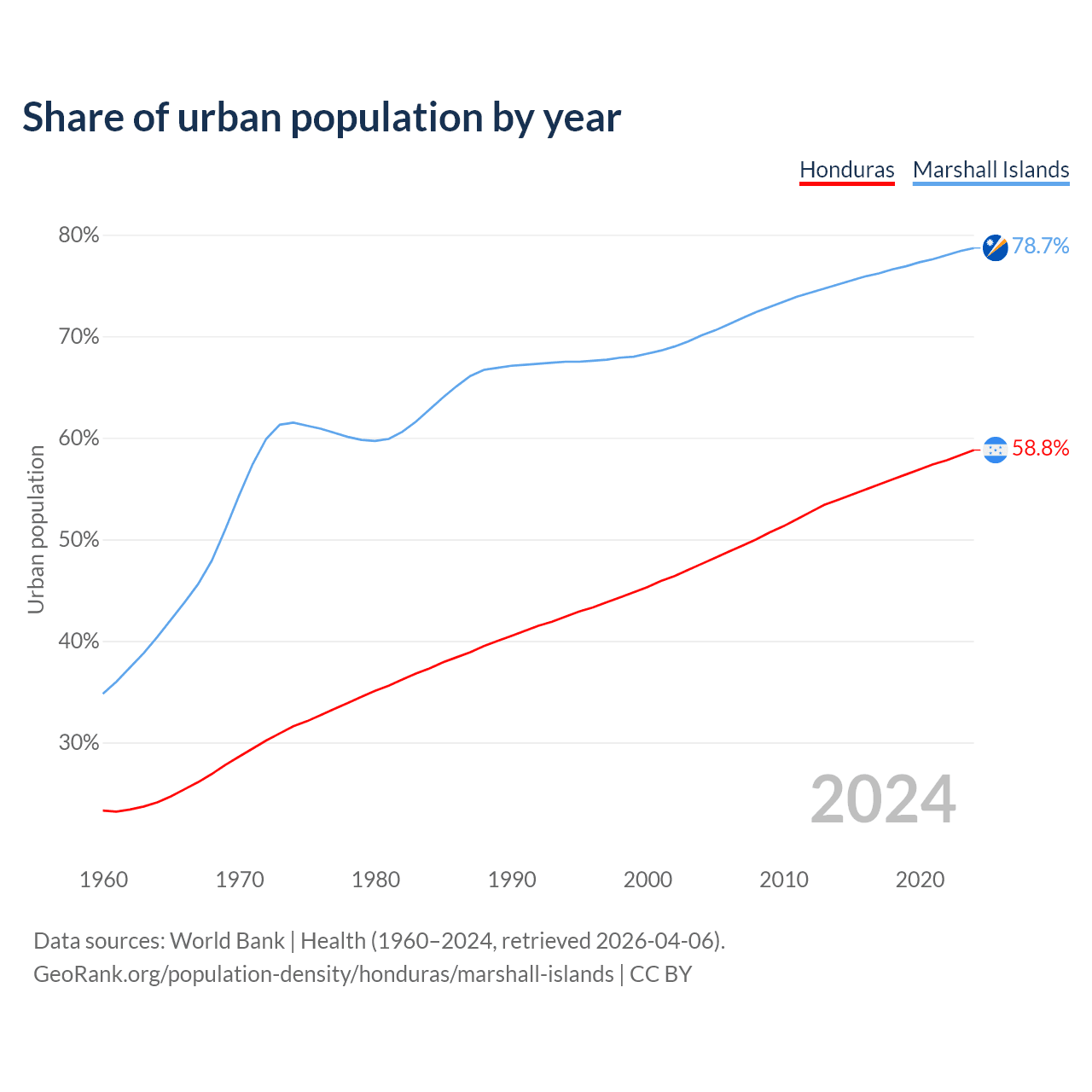 From 2004 to 2024, the share of urban population changed from 47.6% to 58.8% in Honduras and from 70.1% to 78.7% in the Marshall Islands.