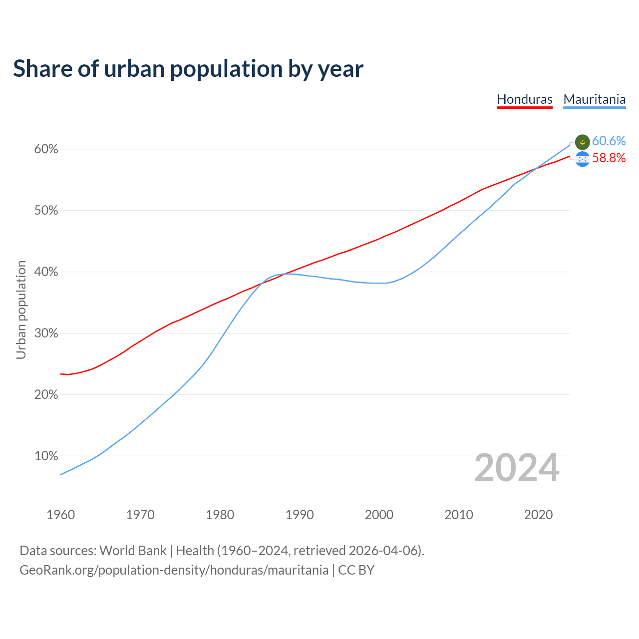 From 2004 to 2024, the share of urban population changed from 47.6% to 58.8% in Honduras and from 39.6% to 60.6% in Mauritania.