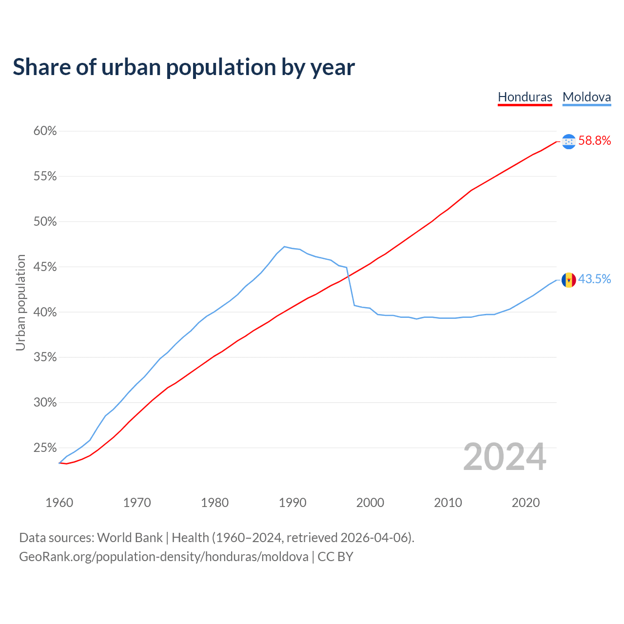 From 2004 to 2024, the share of urban population changed from 47.6% to 58.8% in Honduras and from 39.4% to 43.5% in Moldova.