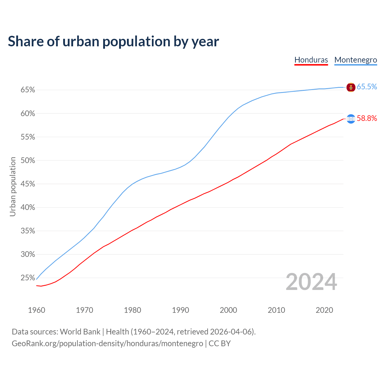 From 2004 to 2024, the share of urban population changed from 47.6% to 58.8% in Honduras and from 62.2% to 65.5% in Montenegro.
