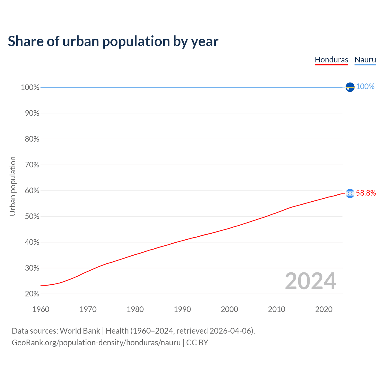 From 2004 to 2024, the share of urban population changed from 47.6% to 58.8% in Honduras and from 100% to 100% in Nauru.