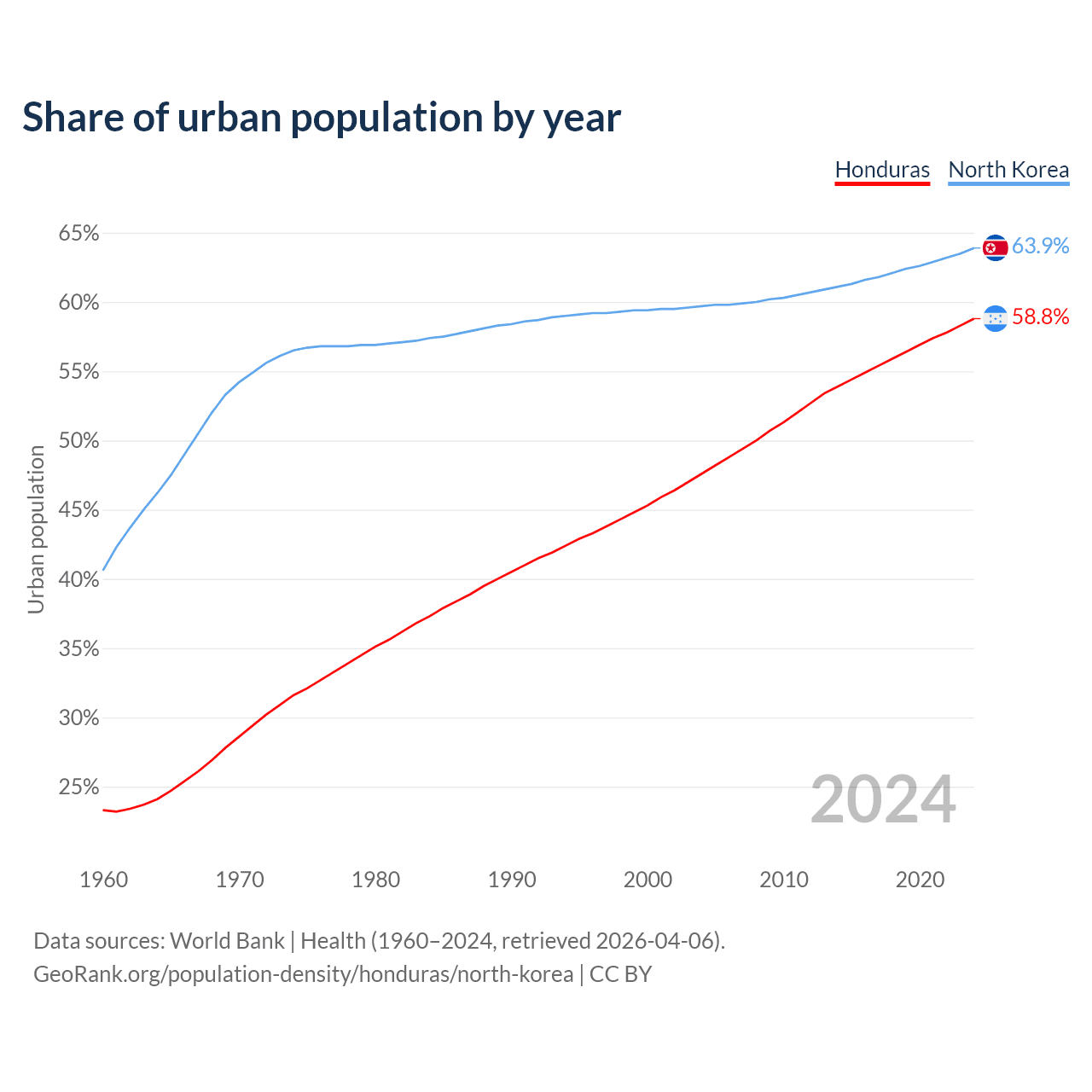 From 2004 to 2024, the share of urban population changed from 47.6% to 58.8% in Honduras and from 59.7% to 63.9% in North Korea.