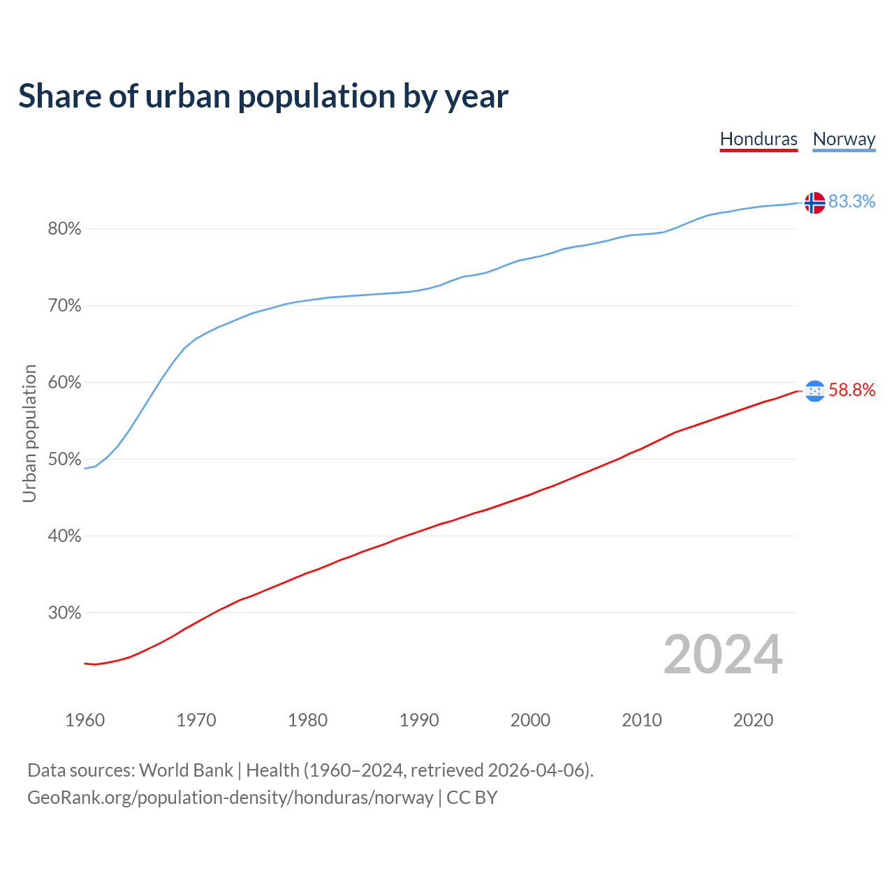 From 2004 to 2024, the share of urban population changed from 47.6% to 58.8% in Honduras and from 77.6% to 83.3% in Norway.