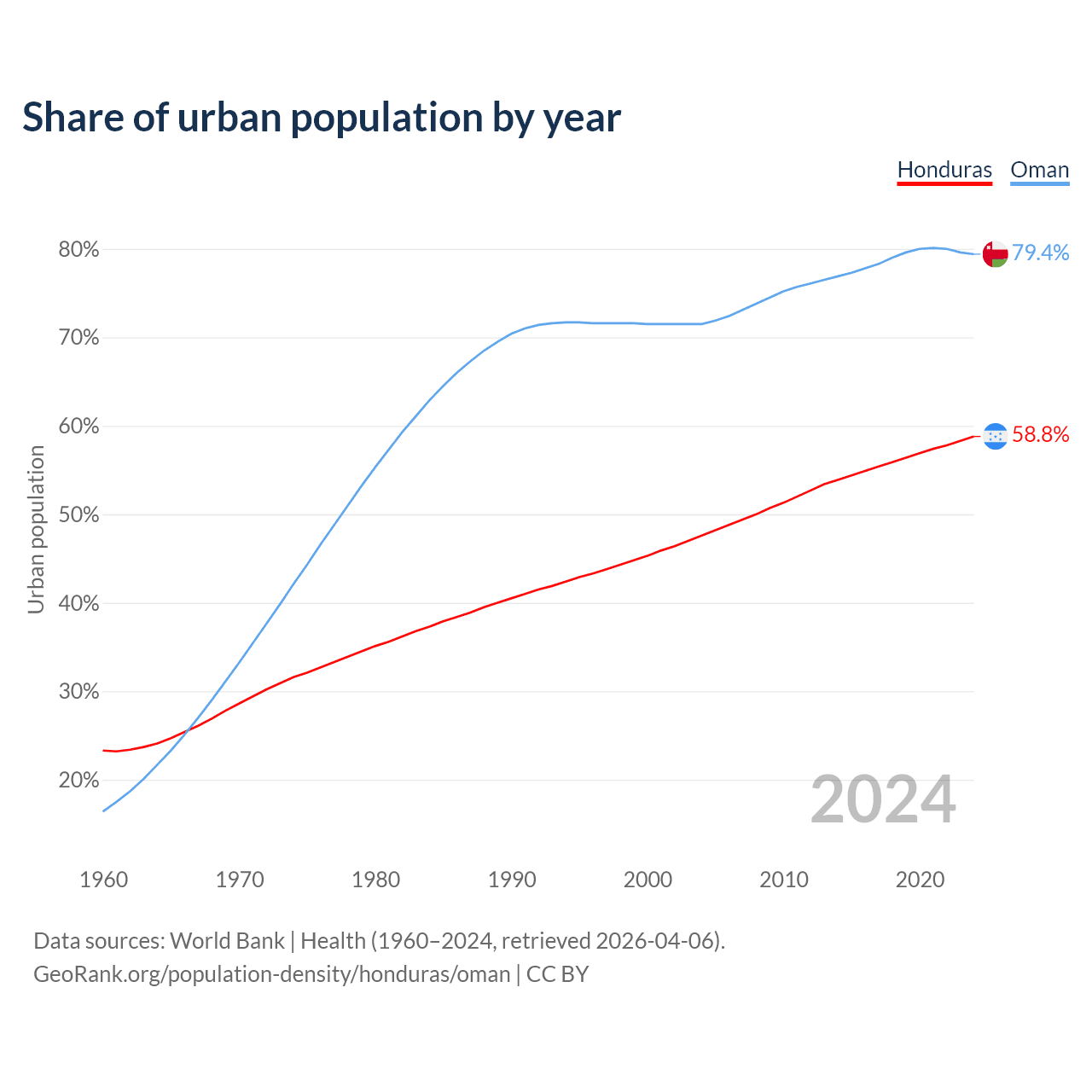 From 2004 to 2024, the share of urban population changed from 47.6% to 58.8% in Honduras and from 71.5% to 79.4% in Oman.