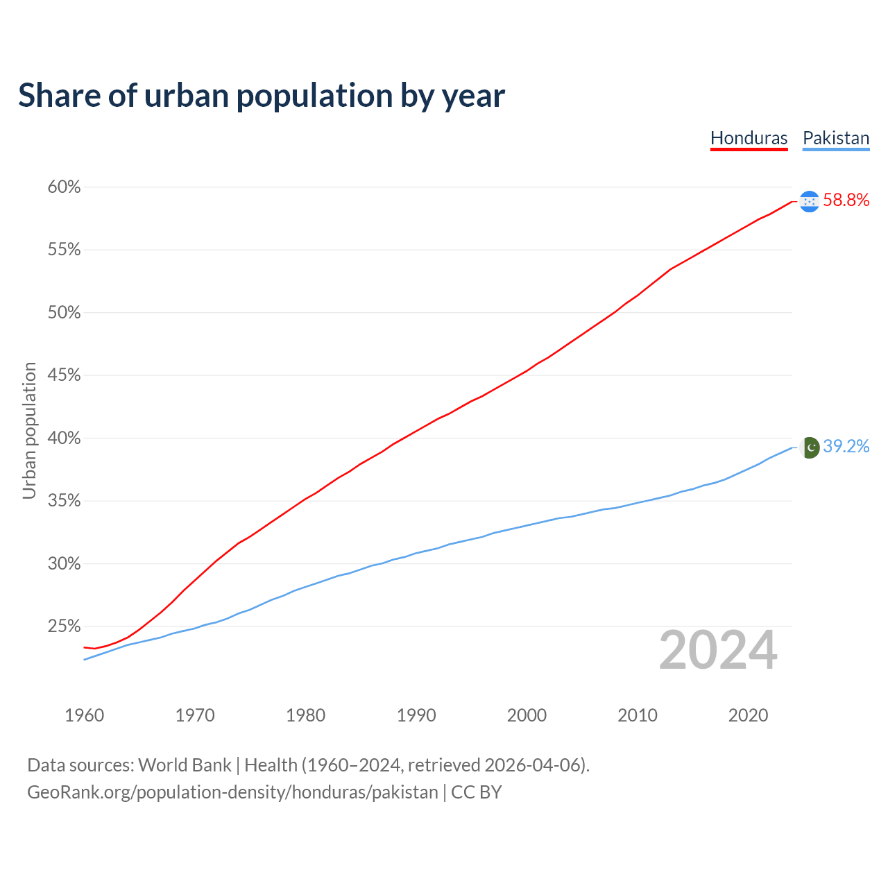 From 2004 to 2024, the share of urban population changed from 47.6% to 58.8% in Honduras and from 33.7% to 39.2% in Pakistan.