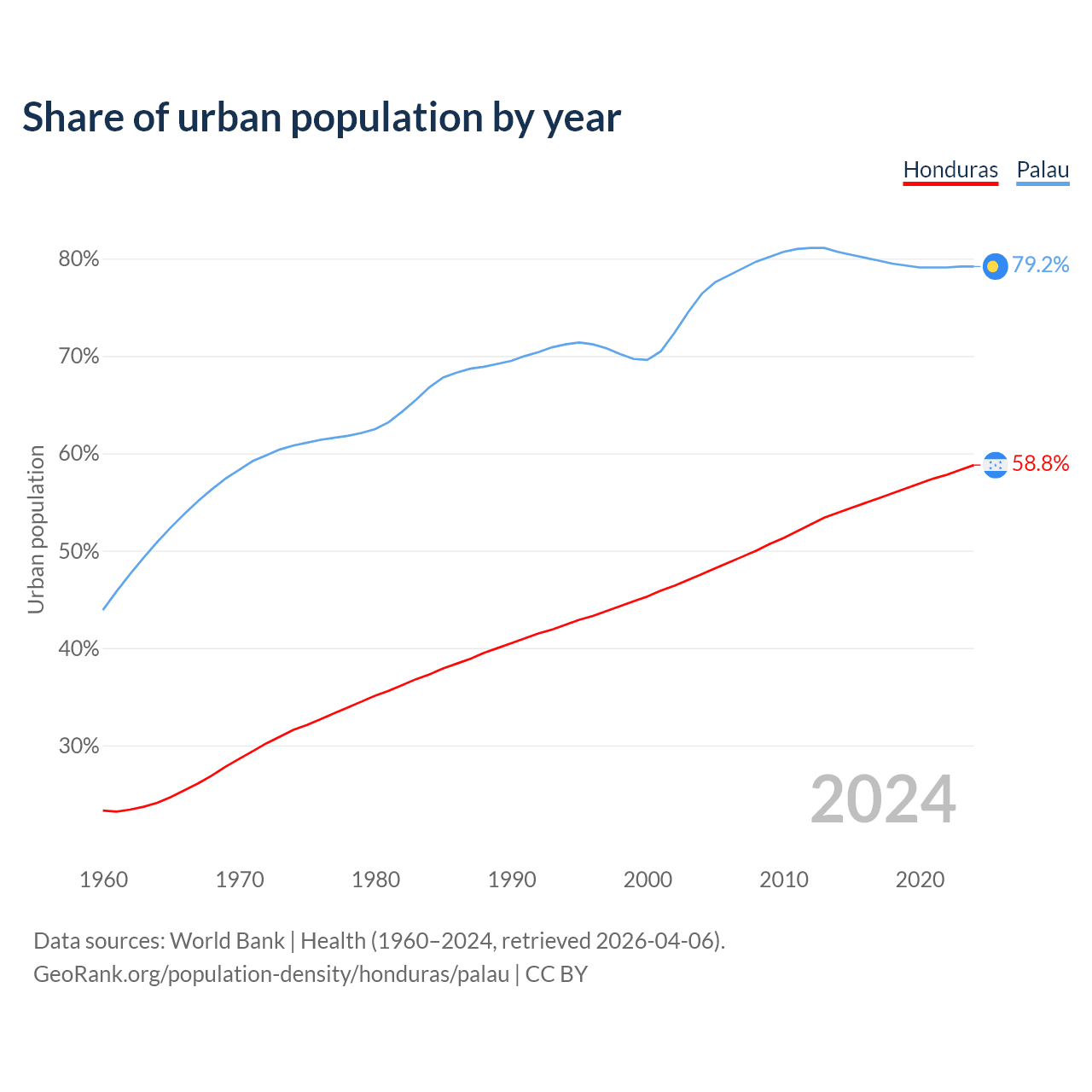 From 2004 to 2024, the share of urban population changed from 47.6% to 58.8% in Honduras and from 76.4% to 79.2% in Palau.