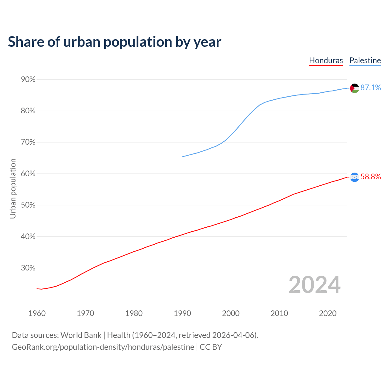 From 2004 to 2024, the share of urban population changed from 47.6% to 58.8% in Honduras and from 79% to 87.1% in Palestine.