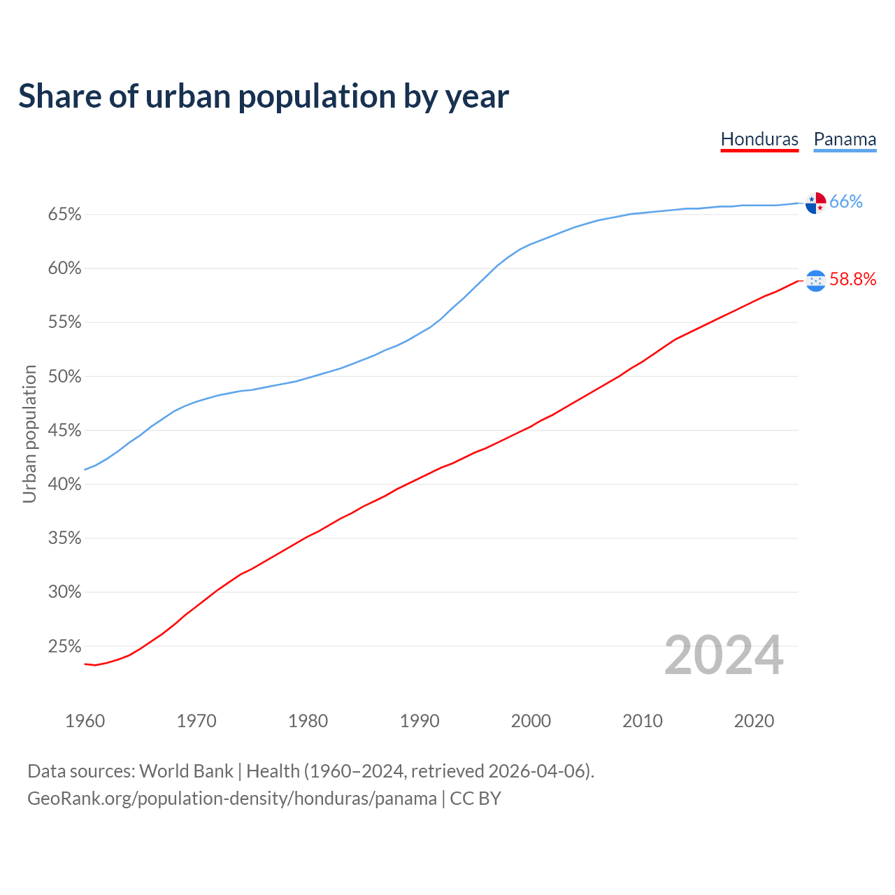 From 2004 to 2024, the share of urban population changed from 47.6% to 58.8% in Honduras and from 63.8% to 66% in Panama.