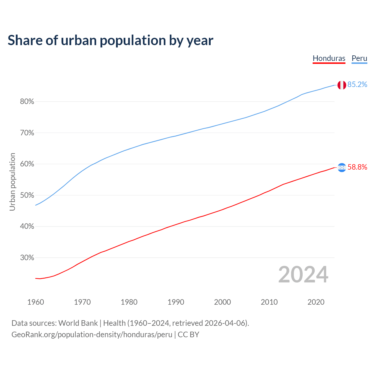 From 2004 to 2024, the share of urban population changed from 47.6% to 58.8% in Honduras and from 74.4% to 85.2% in Peru.