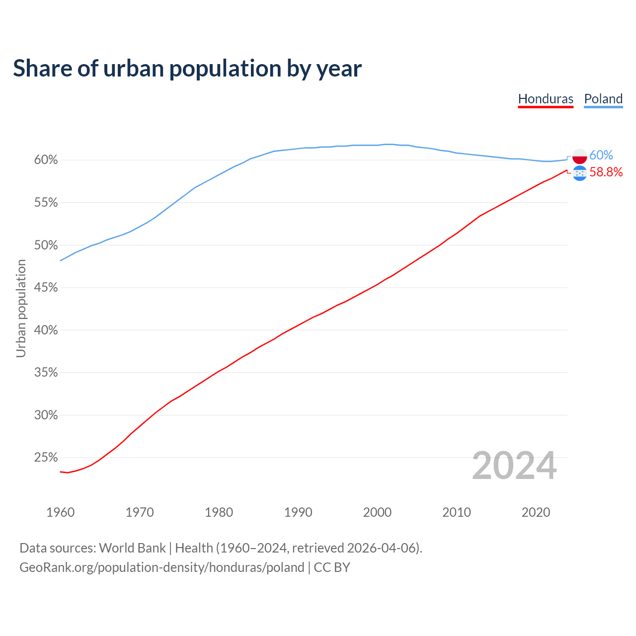 From 2004 to 2024, the share of urban population changed from 47.6% to 58.8% in Honduras and from 61.7% to 60% in Poland.