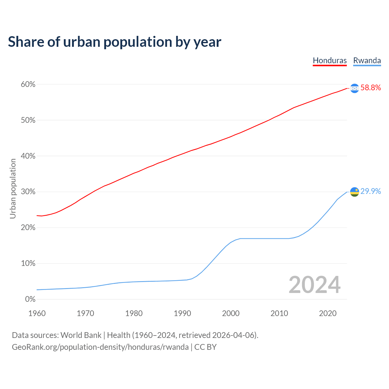 From 2004 to 2024, the share of urban population changed from 47.6% to 58.8% in Honduras and from 16.9% to 29.9% in Rwanda.
