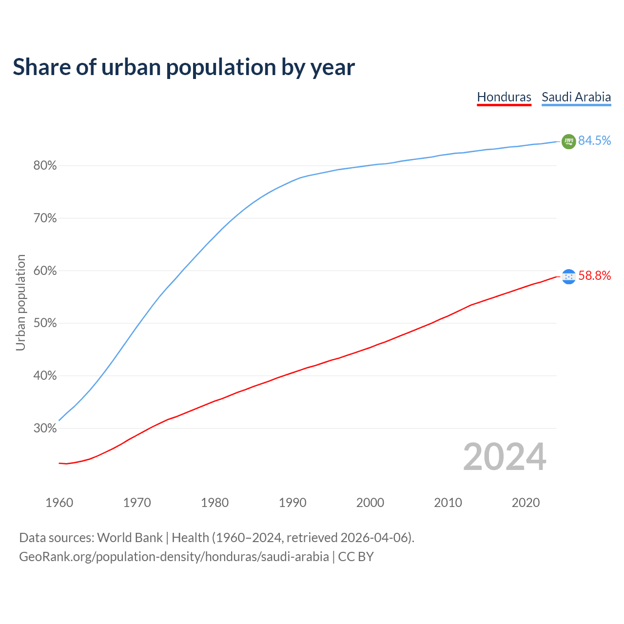 From 2004 to 2024, the share of urban population changed from 47.6% to 58.8% in Honduras and from 80.8% to 84.5% in Saudi Arabia.