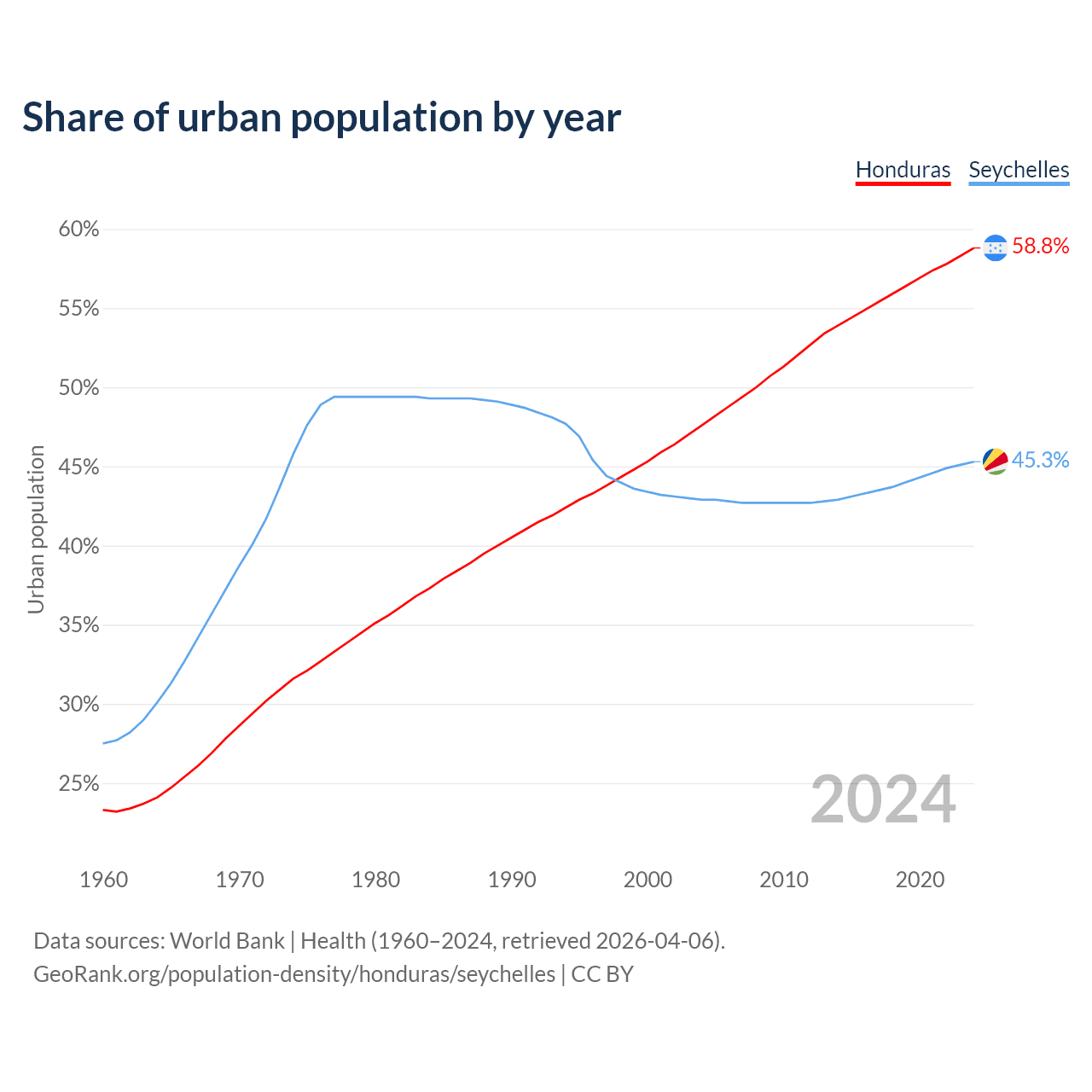 From 2004 to 2024, the share of urban population changed from 47.6% to 58.8% in Honduras and from 42.9% to 45.3% in the Seychelles.