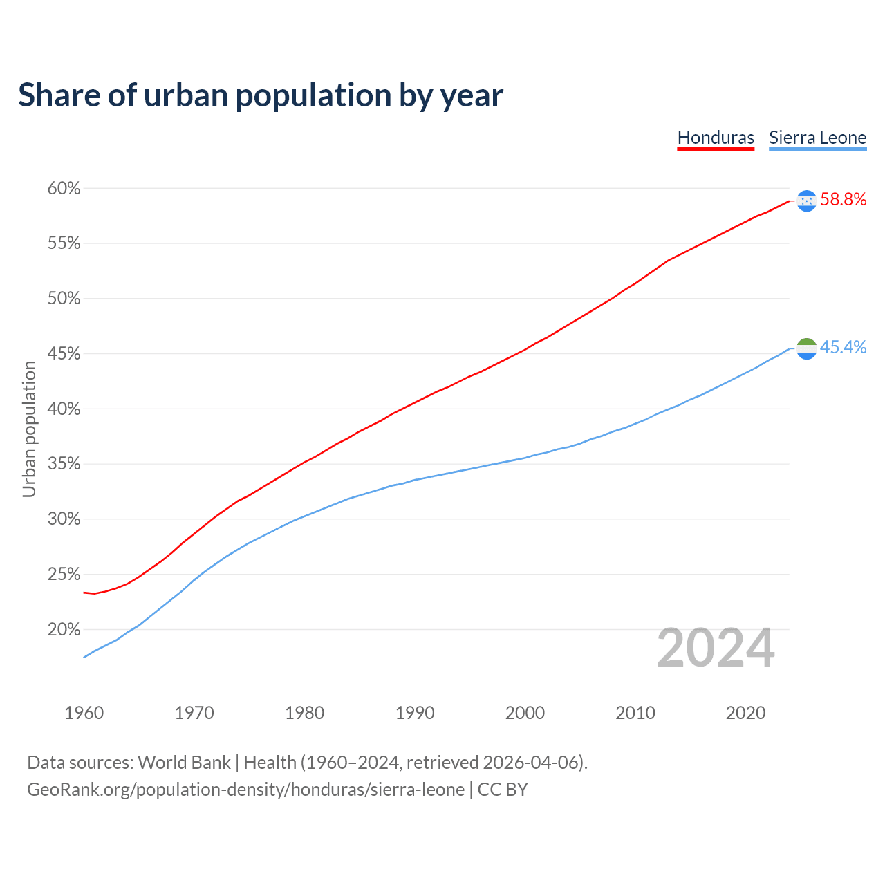 From 2004 to 2024, the share of urban population changed from 47.6% to 58.8% in Honduras and from 36.5% to 45.4% in Sierra Leone.