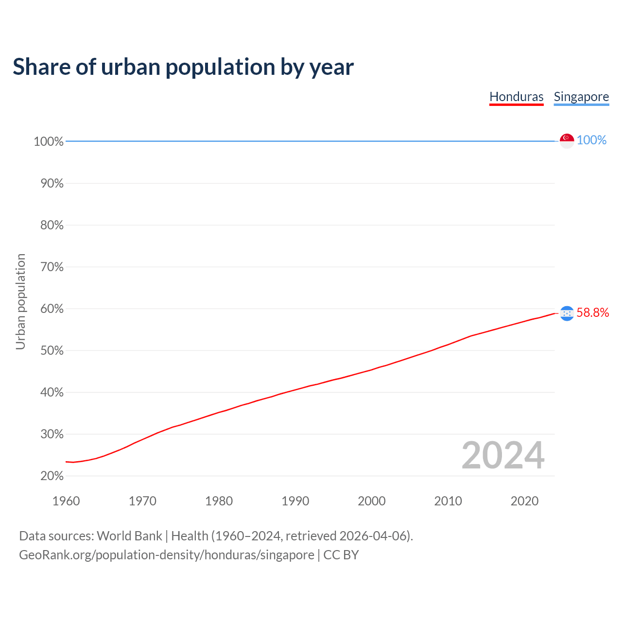 From 2004 to 2024, the share of urban population changed from 47.6% to 58.8% in Honduras and from 100% to 100% in Singapore.