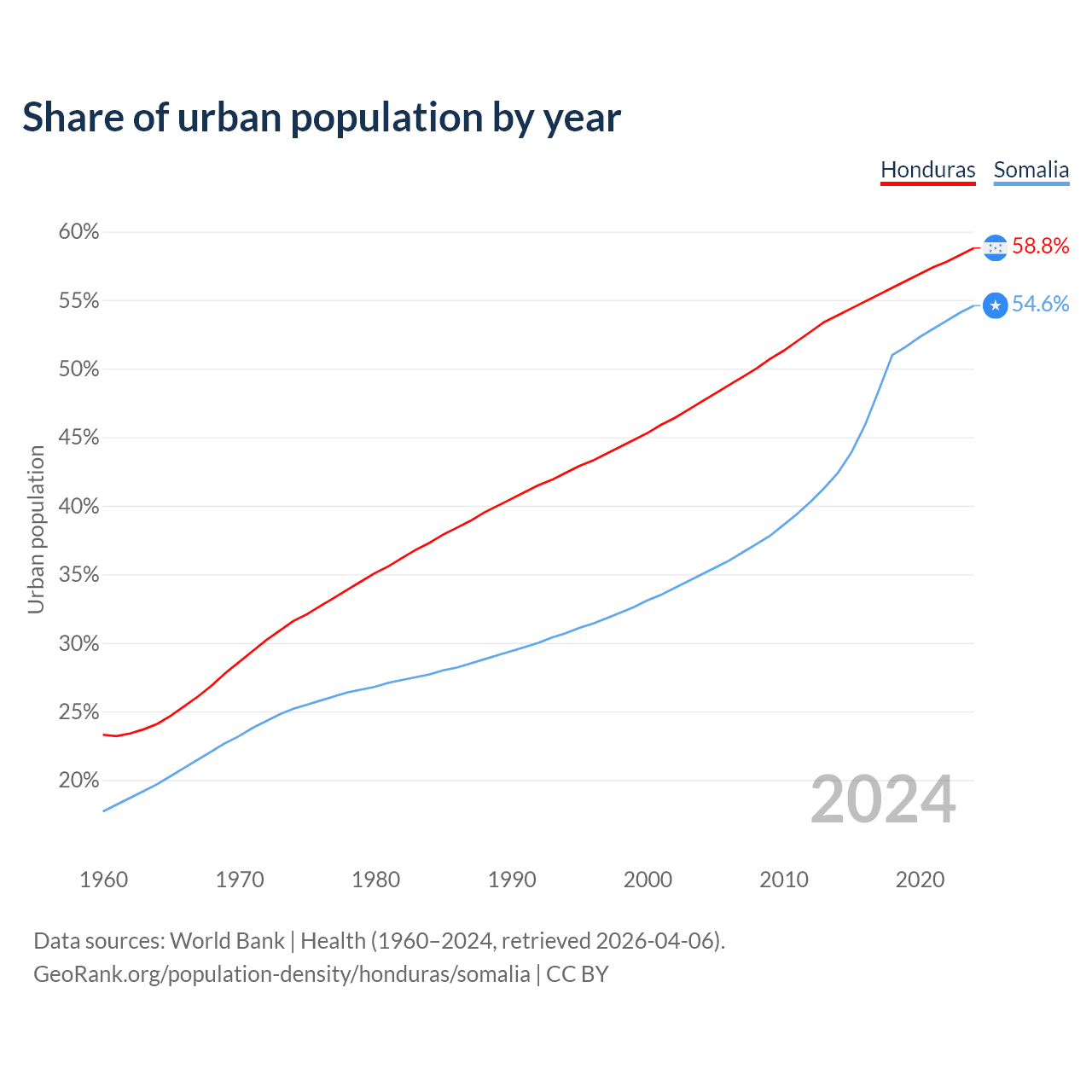 From 2004 to 2024, the share of urban population changed from 47.6% to 58.8% in Honduras and from 35% to 54.6% in Somalia.