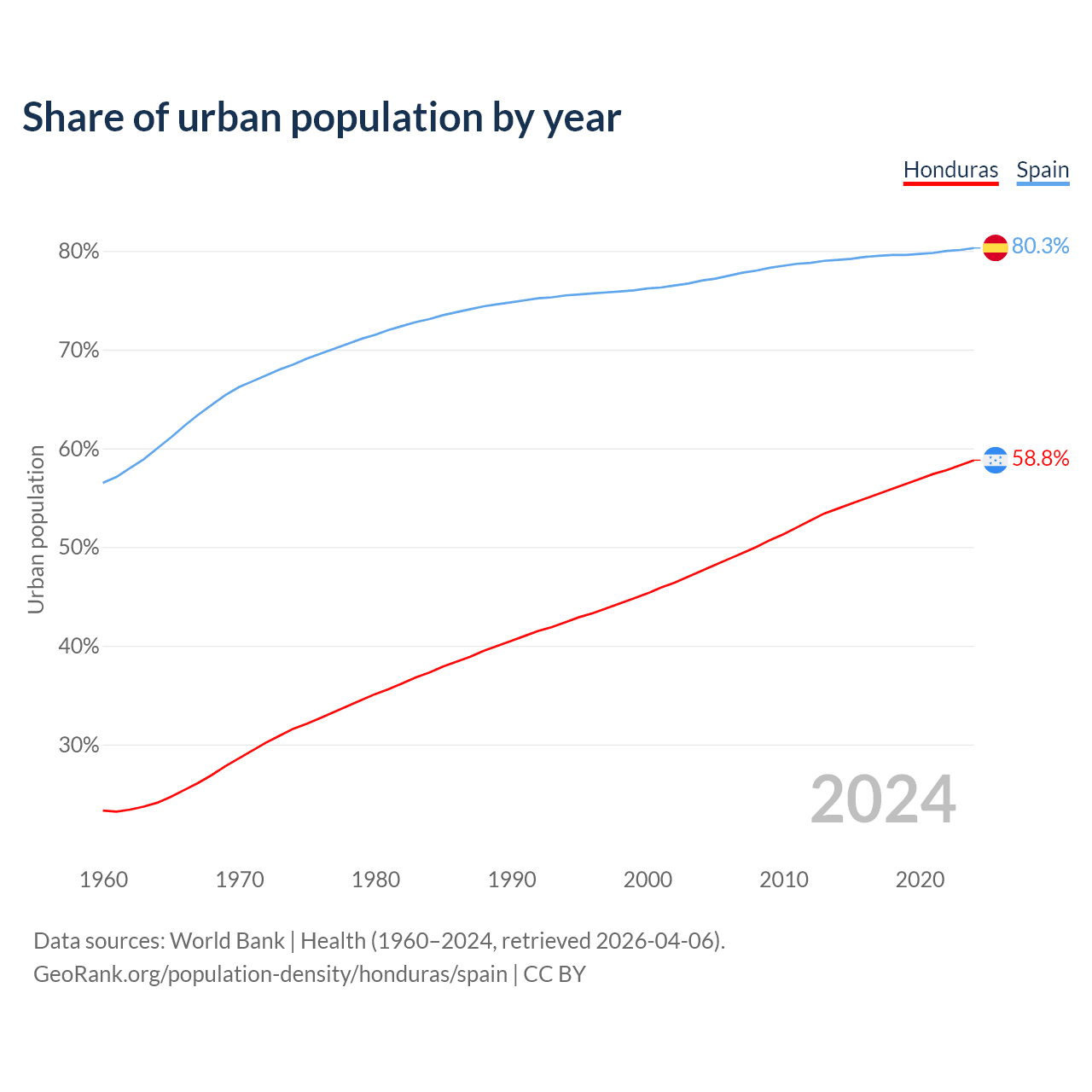 From 2004 to 2024, the share of urban population changed from 47.6% to 58.8% in Honduras and from 77% to 80.3% in Spain.