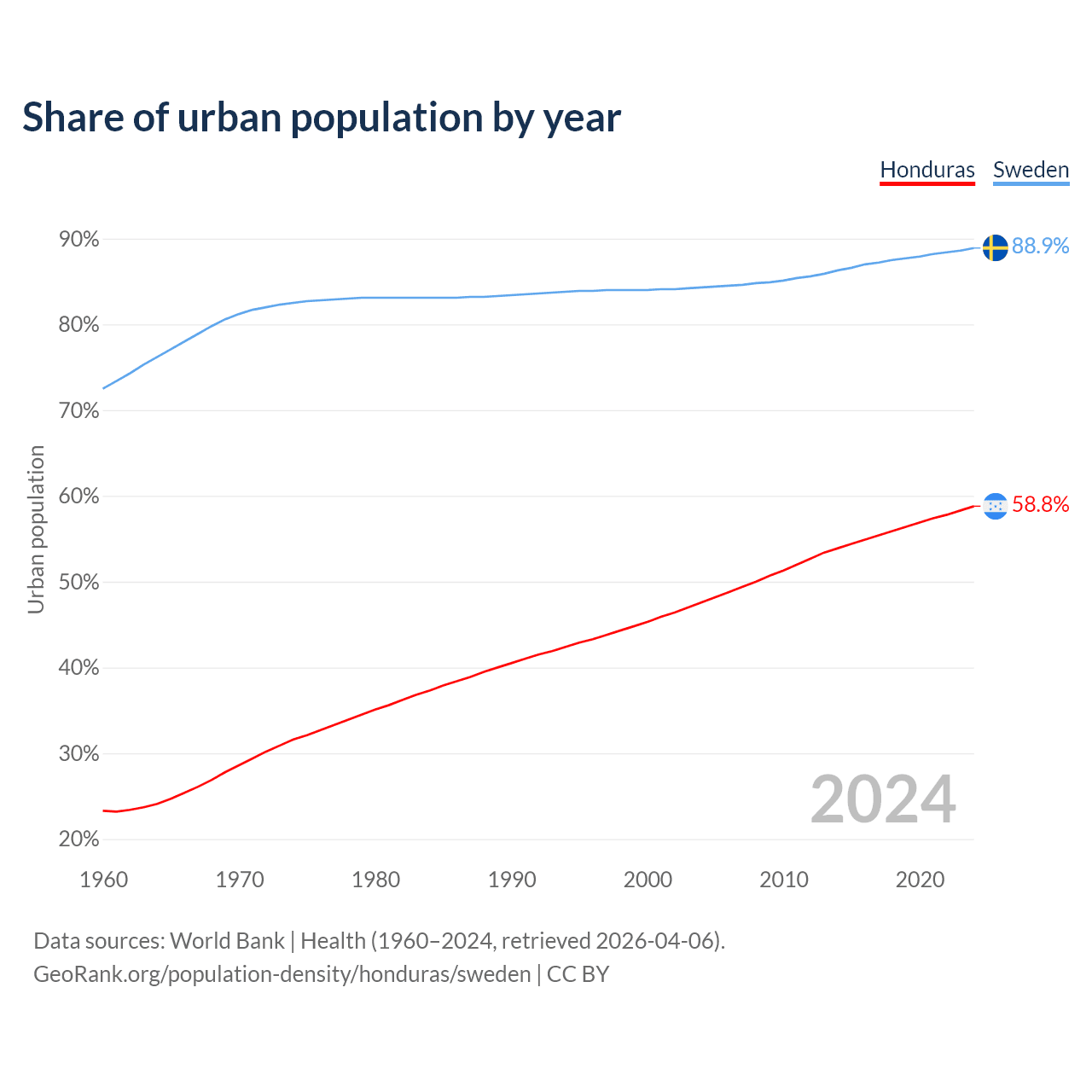 From 2004 to 2024, the share of urban population changed from 47.6% to 58.8% in Honduras and from 84.3% to 88.9% in Sweden.