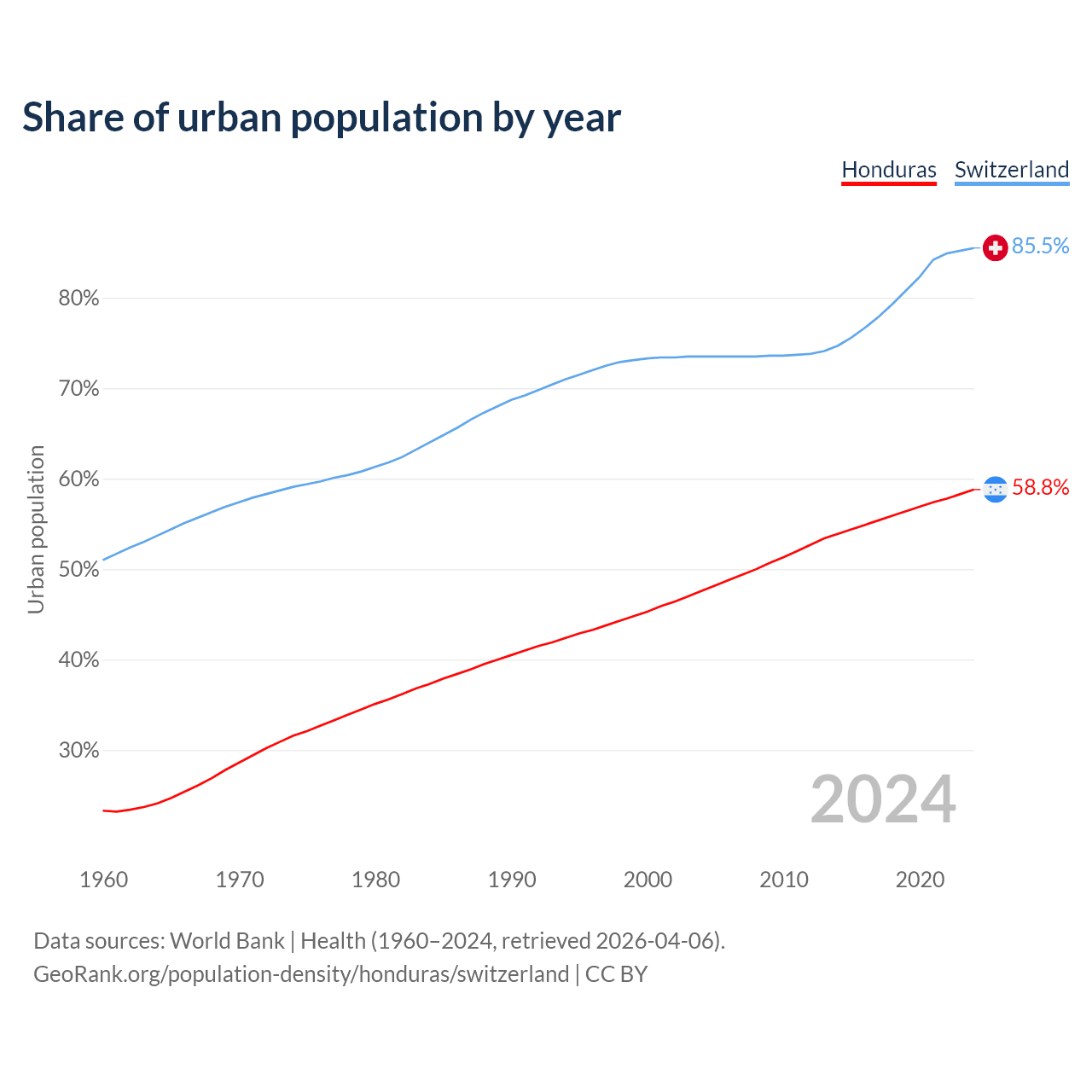 From 2004 to 2024, the share of urban population changed from 47.6% to 58.8% in Honduras and from 73.5% to 85.5% in Switzerland.