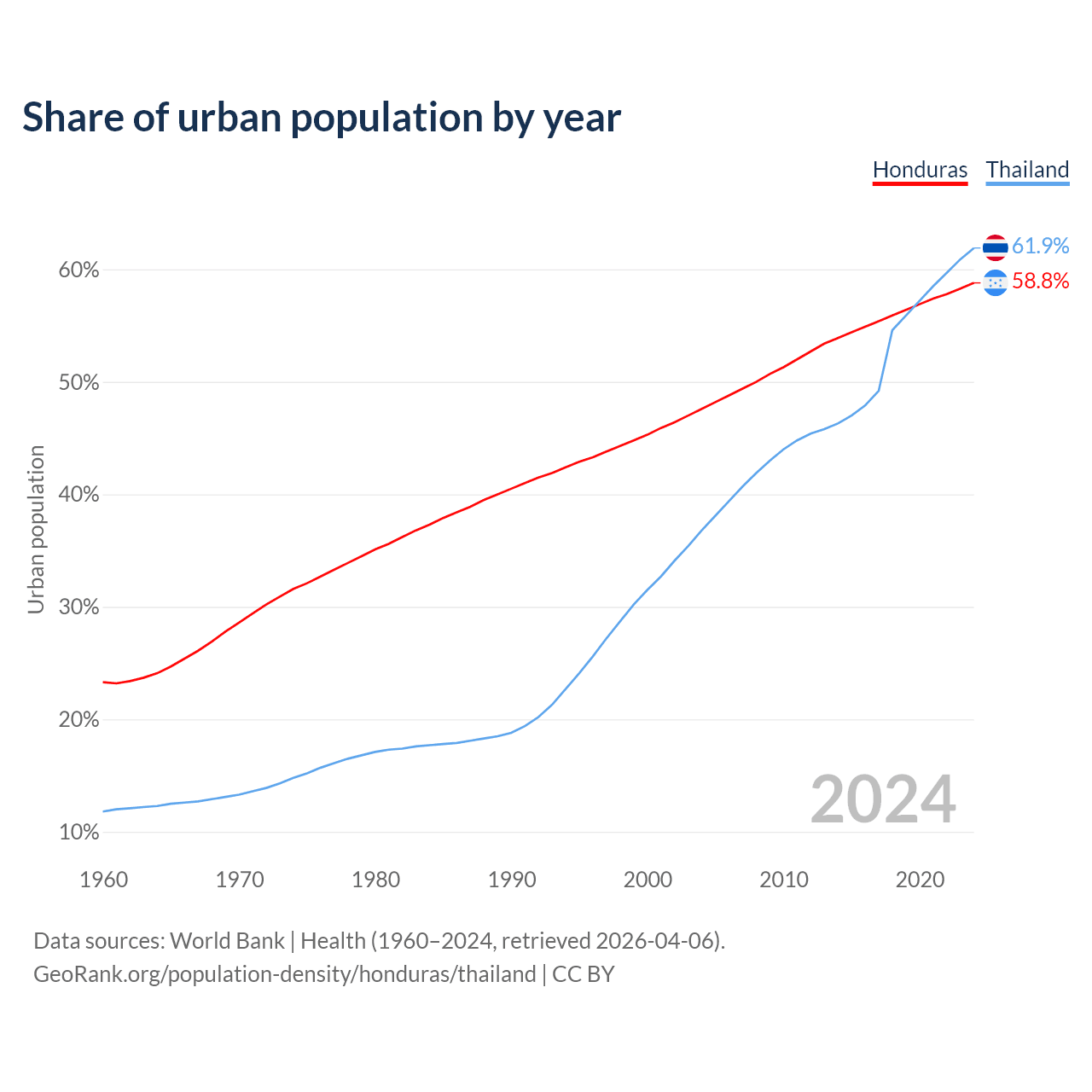 From 2004 to 2024, the share of urban population changed from 47.6% to 58.8% in Honduras and from 36.8% to 61.9% in Thailand.