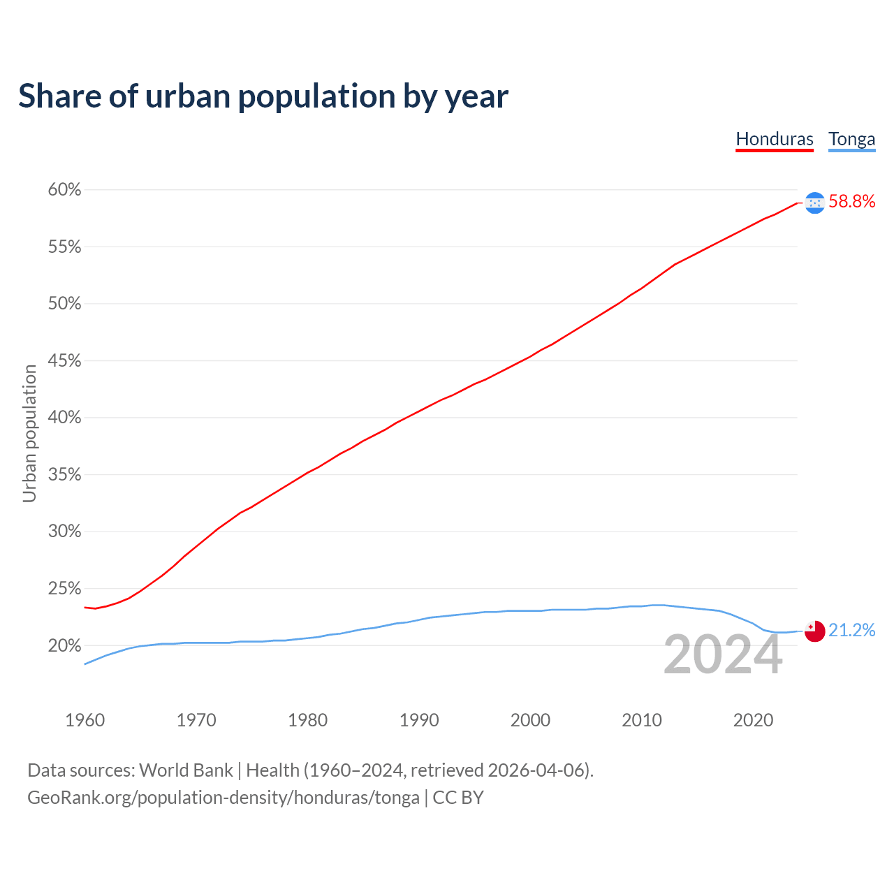 From 2004 to 2024, the share of urban population changed from 47.6% to 58.8% in Honduras and from 23.1% to 21.2% in Tonga.