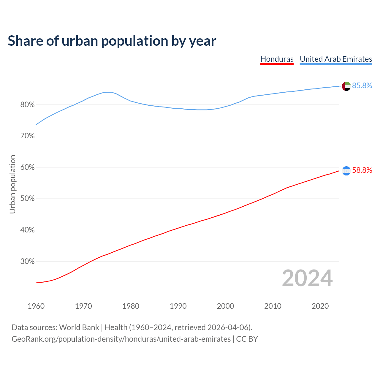 From 2004 to 2024, the share of urban population changed from 47.6% to 58.8% in Honduras and from 81.5% to 85.8% in the United Arab Emirates.