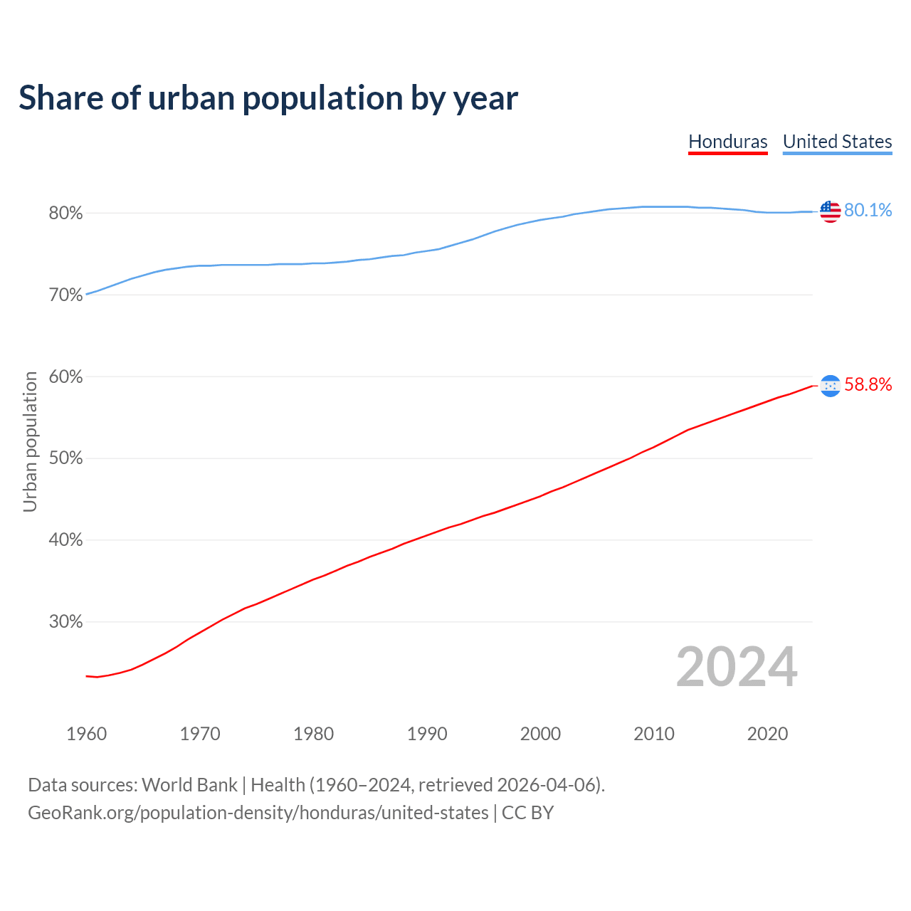 From 2004 to 2024, the share of urban population changed from 47.6% to 58.8% in Honduras and from 80% to 80.1% in the United States.