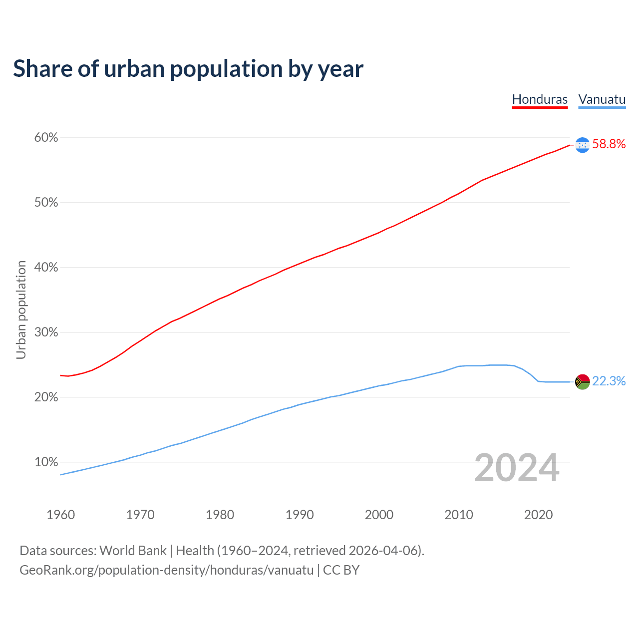 From 2004 to 2024, the share of urban population changed from 47.6% to 58.8% in Honduras and from 22.7% to 22.3% in Vanuatu.