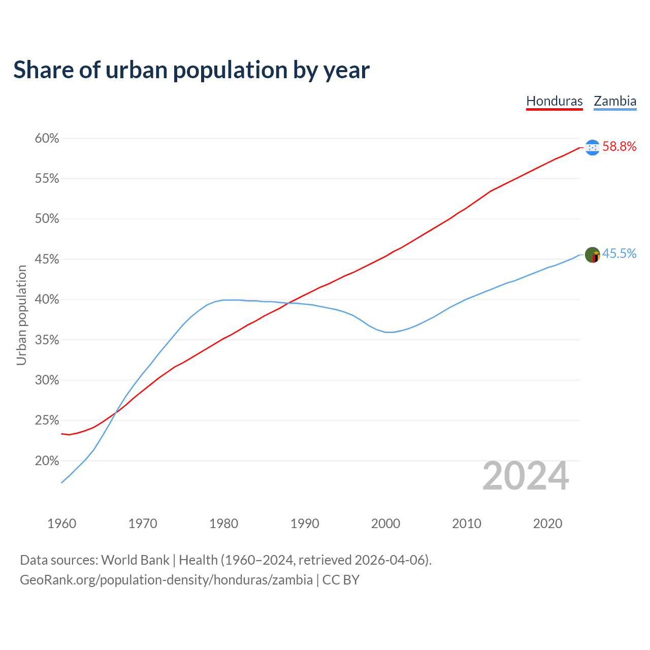 From 2004 to 2024, the share of urban population changed from 47.6% to 58.8% in Honduras and from 36.8% to 45.5% in Zambia.