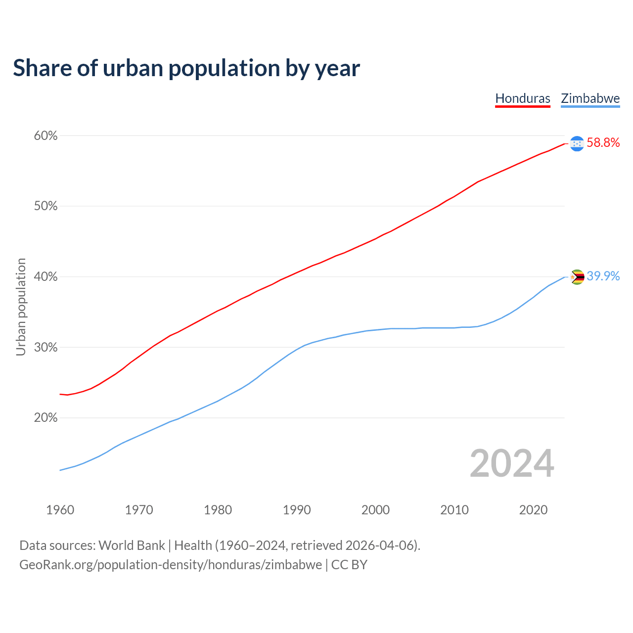 From 2004 to 2024, the share of urban population changed from 47.6% to 58.8% in Honduras and from 32.6% to 39.9% in Zimbabwe.
