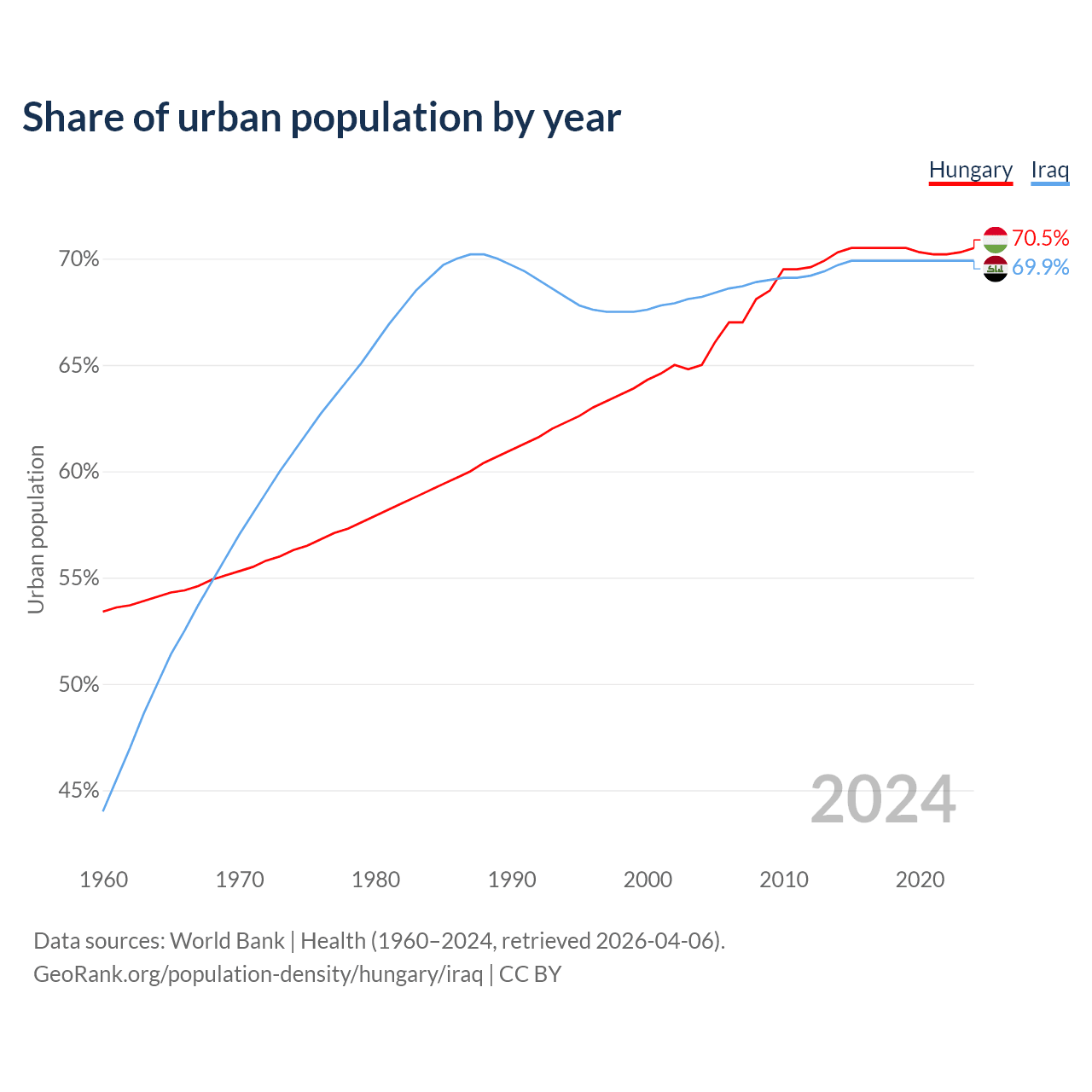 From 2004 to 2024, the share of urban population changed from 65% to 70.5% in Hungary and from 68.2% to 69.9% in Iraq.