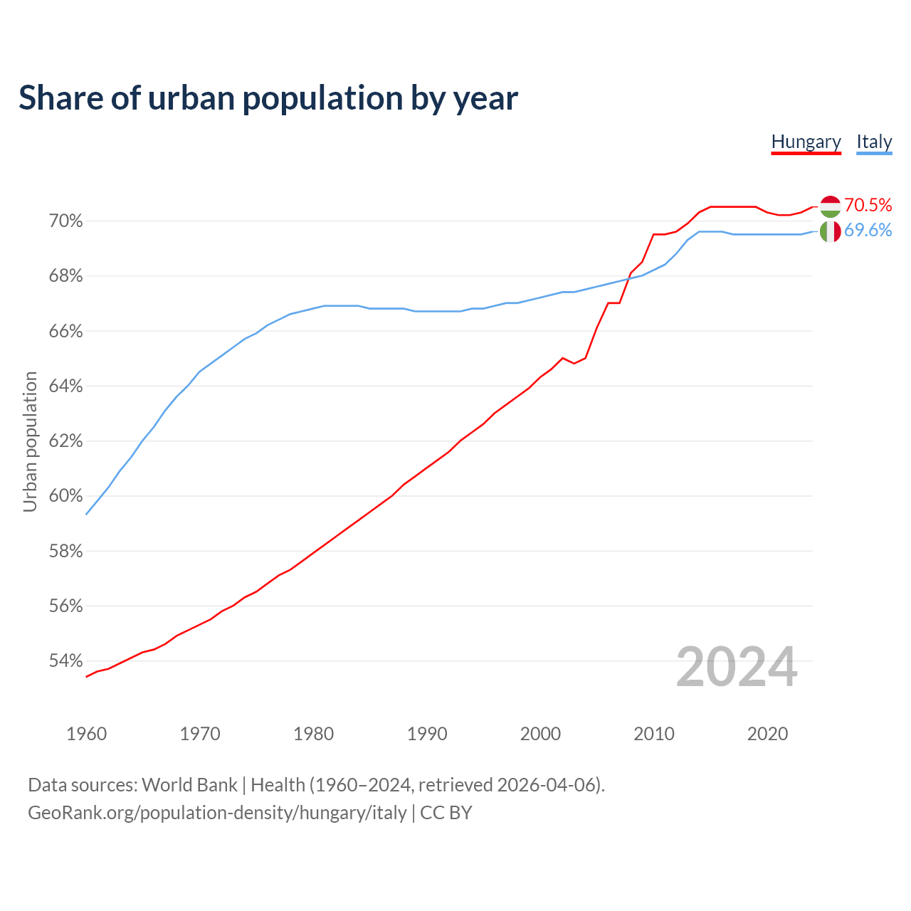From 2004 to 2024, the share of urban population changed from 65% to 70.5% in Hungary and from 67.5% to 69.6% in Italy.