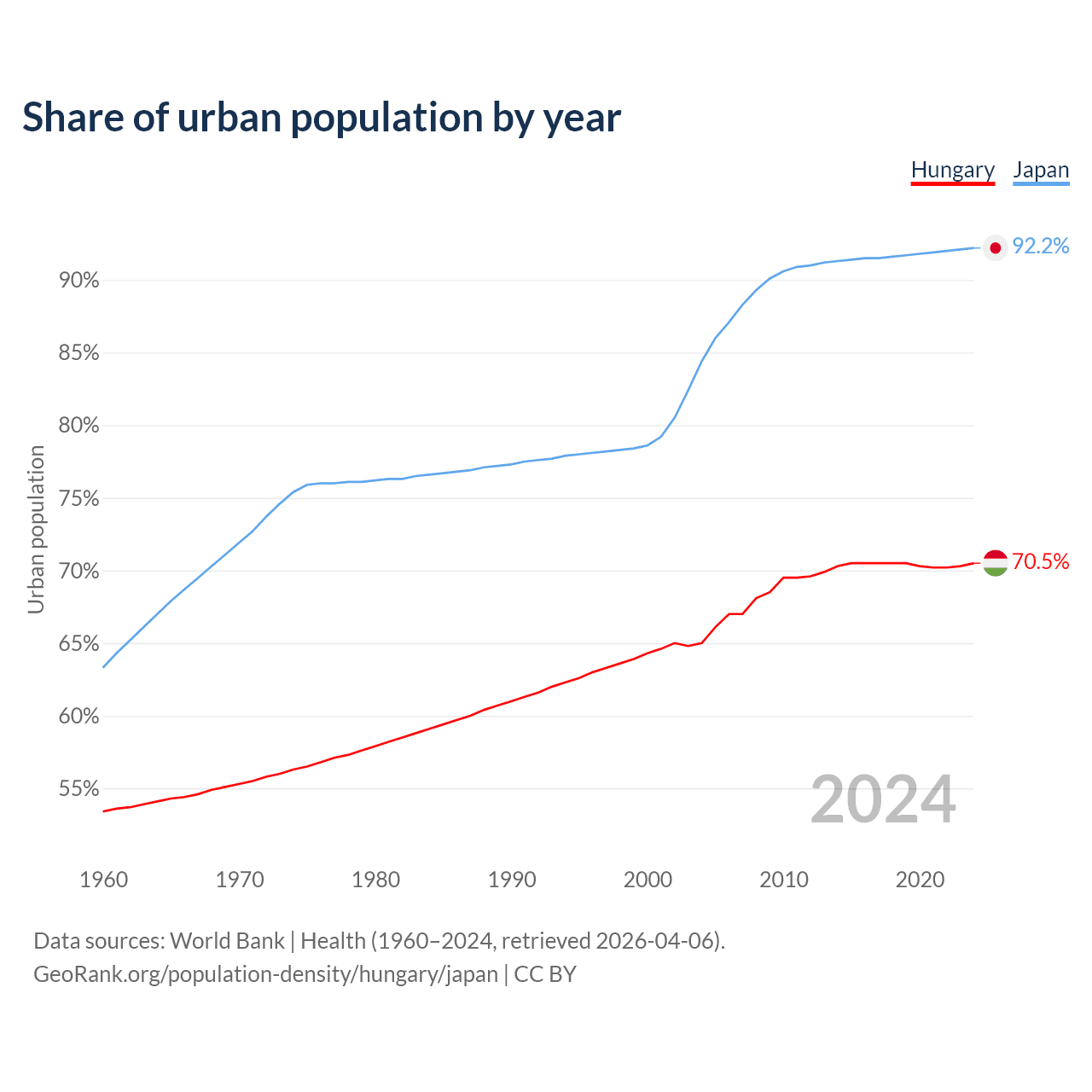 From 2004 to 2024, the share of urban population changed from 65% to 70.5% in Hungary and from 84.4% to 92.2% in Japan.