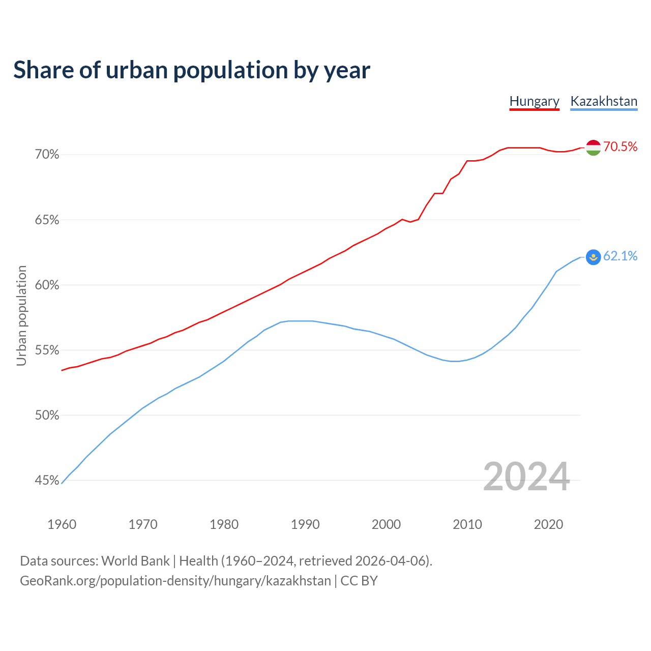 From 2004 to 2024, the share of urban population changed from 65% to 70.5% in Hungary and from 54.9% to 62.1% in Kazakhstan.