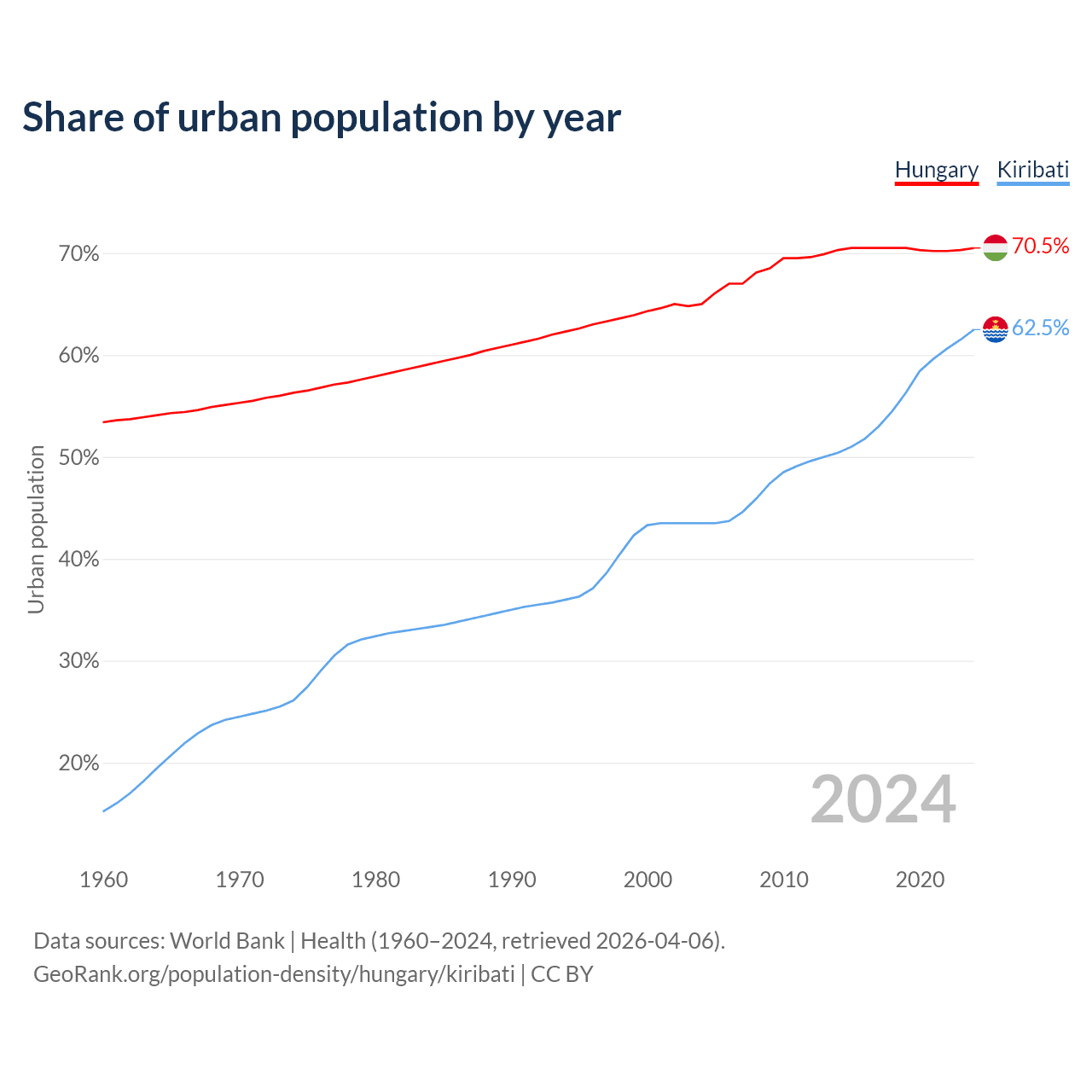 From 2004 to 2024, the share of urban population changed from 65% to 70.5% in Hungary and from 43.5% to 62.5% in Kiribati.