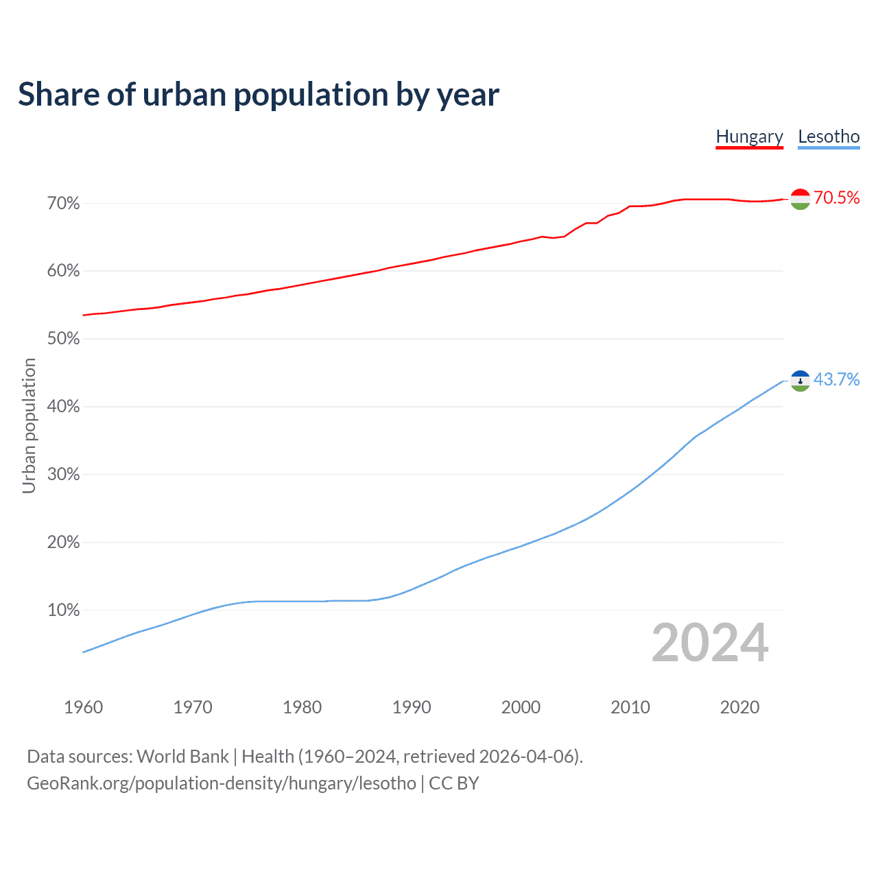 From 2004 to 2024, the share of urban population changed from 65% to 70.5% in Hungary and from 21.8% to 43.7% in Lesotho.
