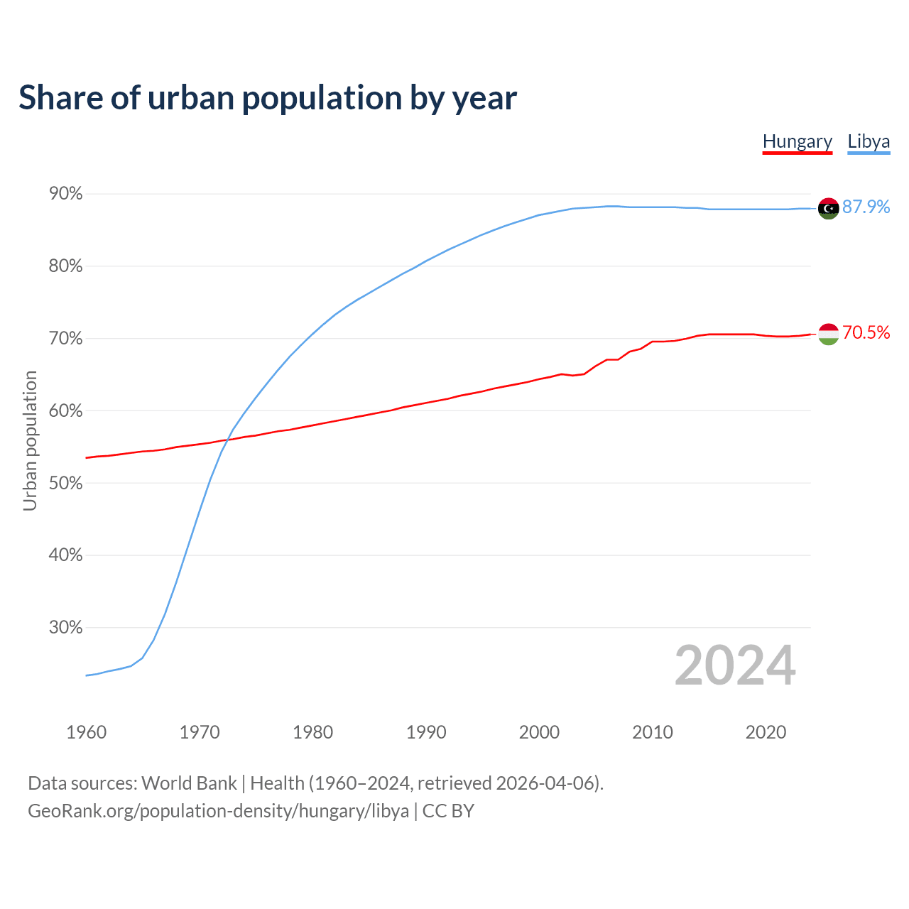 From 2004 to 2024, the share of urban population changed from 65% to 70.5% in Hungary and from 88% to 87.9% in Libya.
