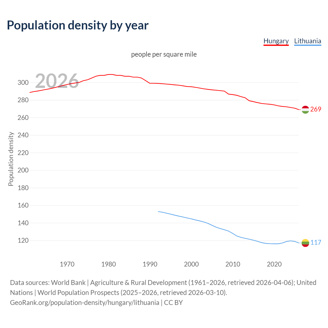 From 2006 to 2026, population density in Hungary decreased by 7.62%, compared to a 13.3% decline in Lithuania.