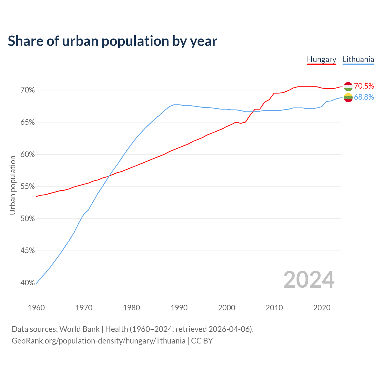 From 2004 to 2024, the share of urban population changed from 65% to 70.5% in Hungary and from 66.6% to 68.8% in Lithuania.