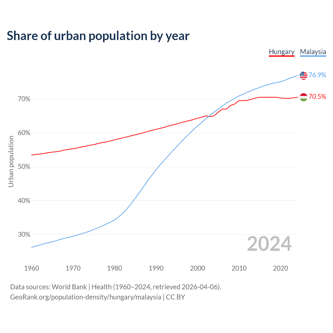 From 2004 to 2024, the share of urban population changed from 65% to 70.5% in Hungary and from 66.1% to 76.9% in Malaysia.