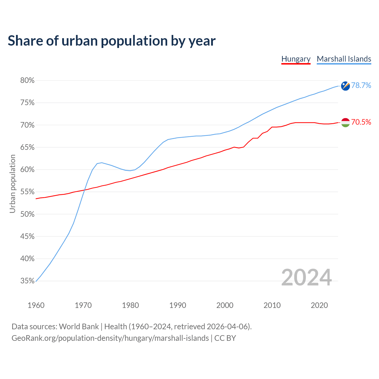 From 2004 to 2024, the share of urban population changed from 65% to 70.5% in Hungary and from 70.1% to 78.7% in the Marshall Islands.