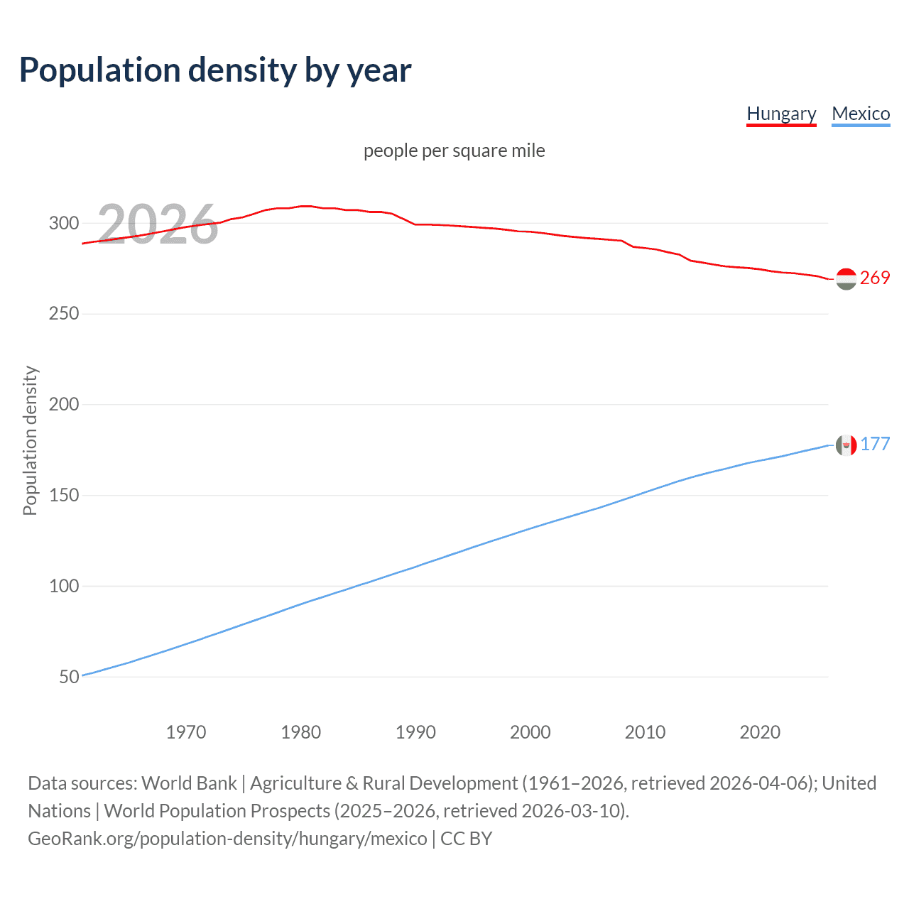 From 2006 to 2026, population density in Hungary decreased by 7.62%, compared to a 24% growth in Mexico.