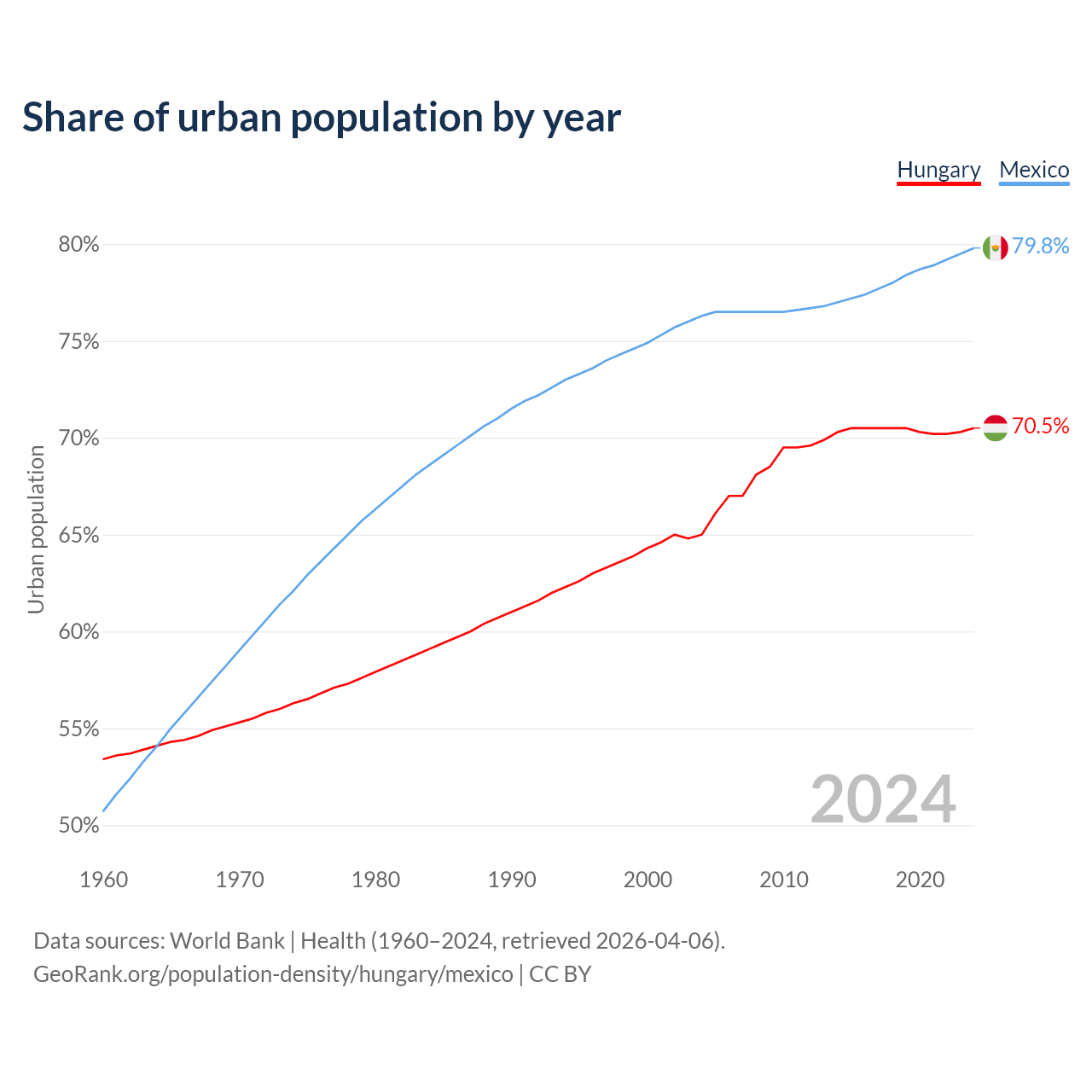 From 2004 to 2024, the share of urban population changed from 65% to 70.5% in Hungary and from 76.3% to 79.8% in Mexico.